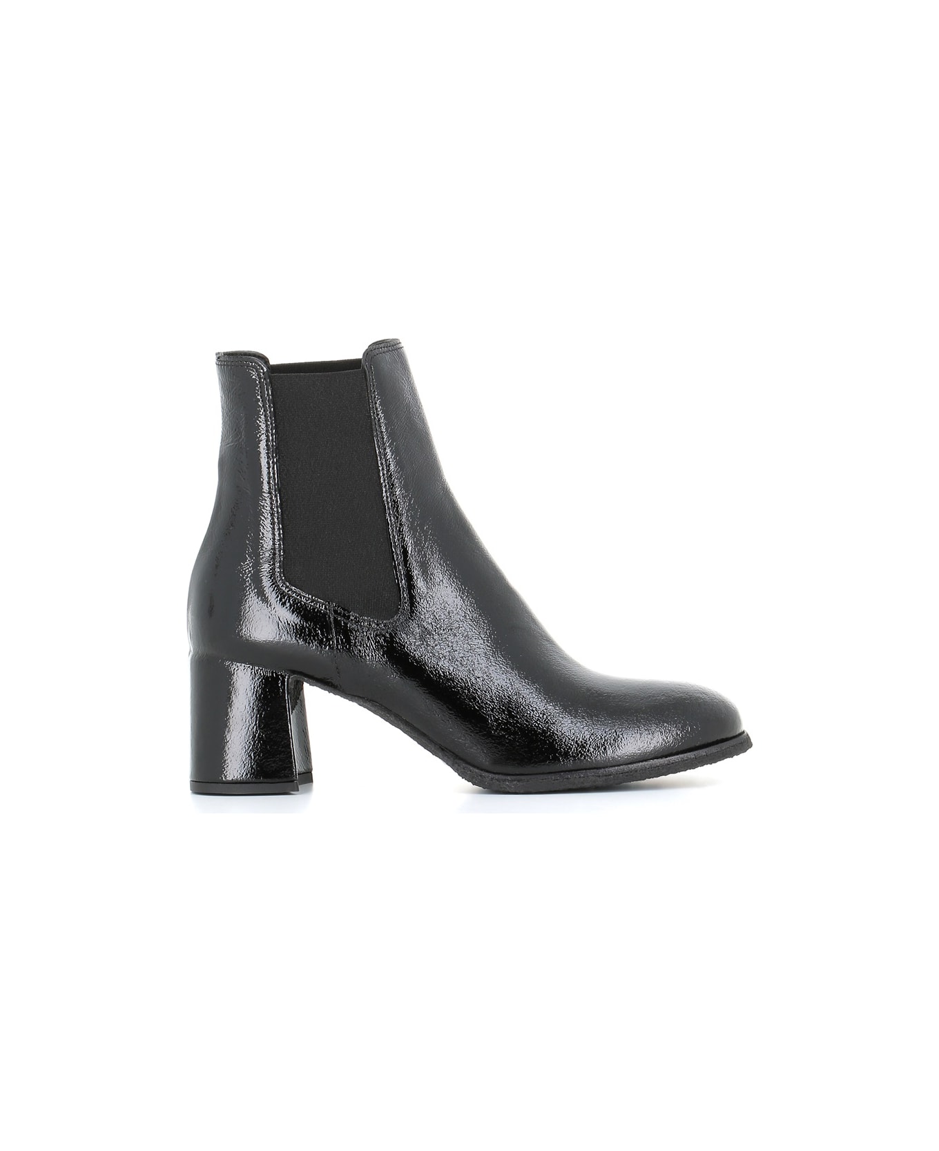 Black shiny leather Chelsea from Del Carlo, featuring by two side elastic in the same color. Lined interior. Flexible sole in natural para. Heel: 6 cm
