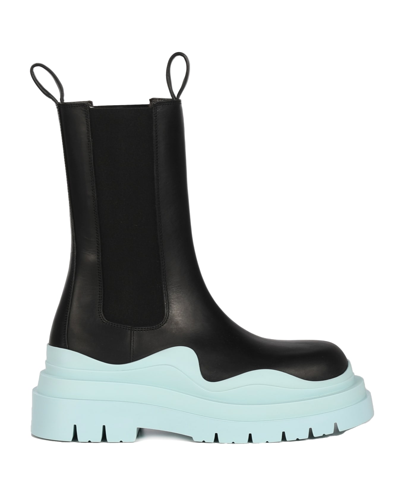 Black-pb-pb Chelsea Tire Boots from Bottega Veneta -Chelsea boots in vegetable tanned leather -Rubber outer sole -Plateau: 5,5 cm -Made in Italy -Colour: Black/Pale Blue -100% Calfskin