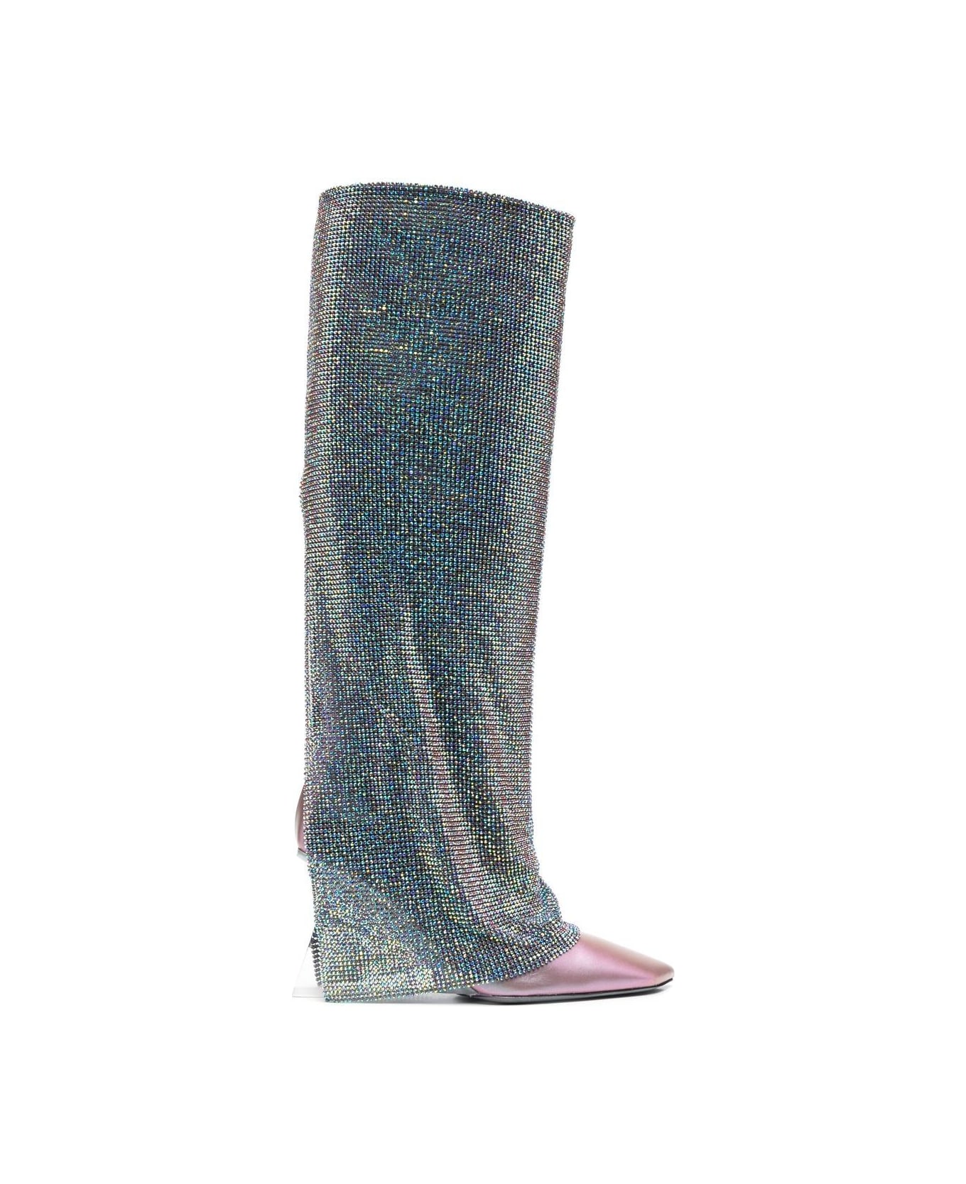 Christine 90mm boots from BENEDETTA BRUZZICHES featuring crystal embellishment, draped detailing, knee-length, pointed toe, high heel, blue and calf leather/crystal.