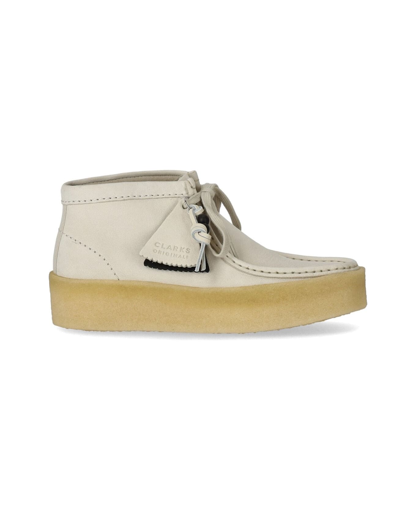 Clarks Wallabee Cup BT ankle boot made of ice-colored nubuck leather, featuring contrasting canvas profiles. Leather lining and insole, rubber platform sole, height 4 cm.