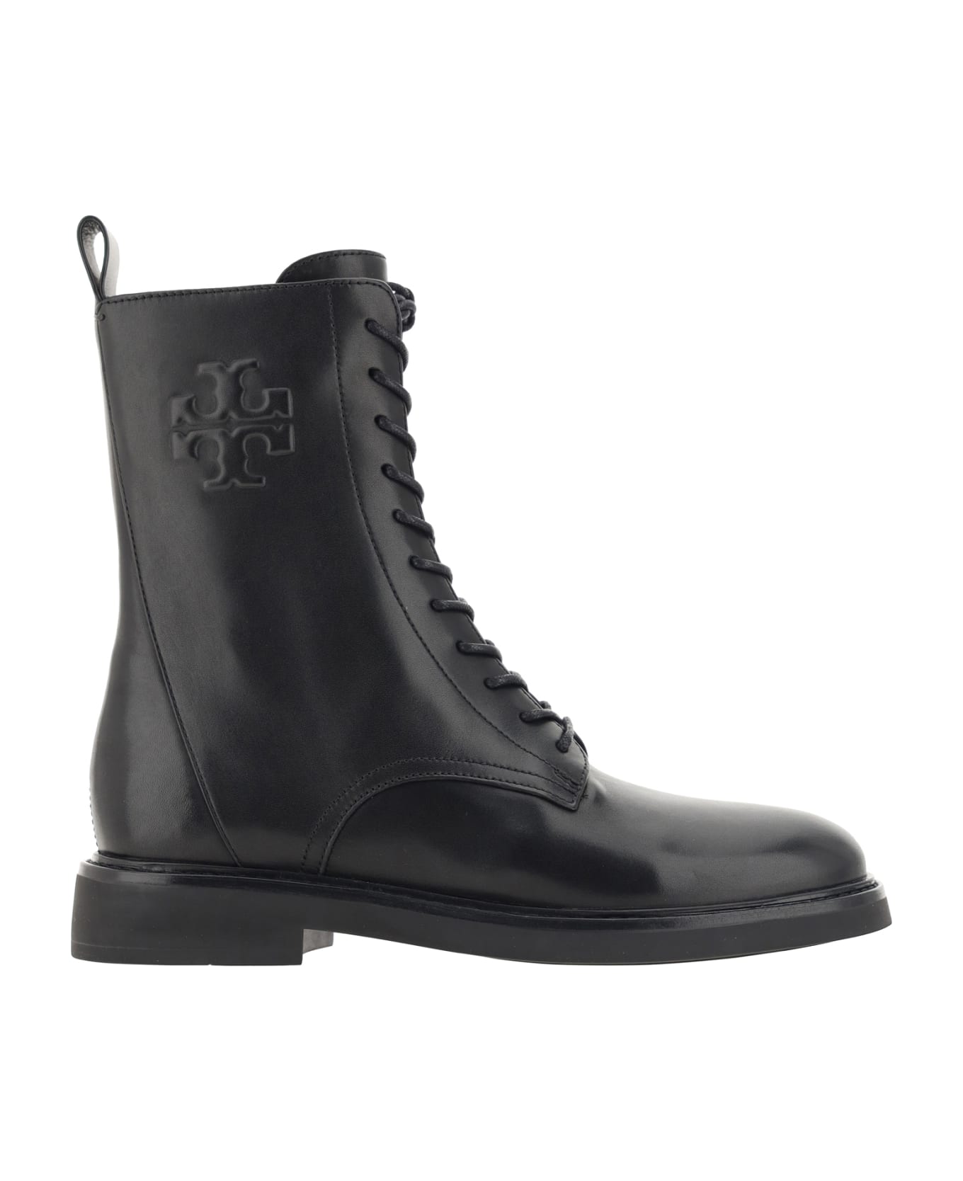 Calfskin combat ankle boots by tory burch, round toe, front closure with laces, ankle model, iconic brand logo pressed on the side panel, tie on the back to facilitate the fit, block heel, flat sole, side closure by zipper.