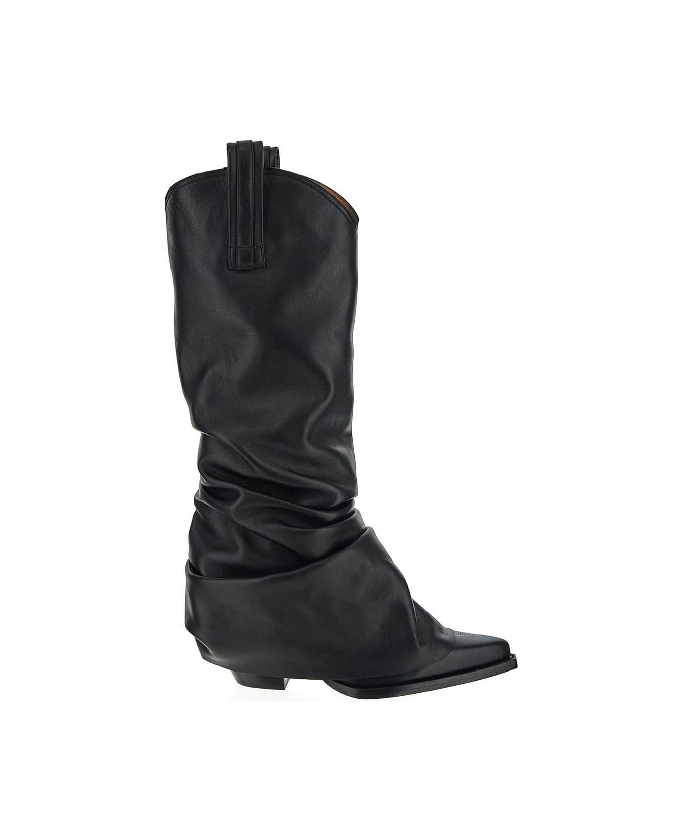 R13 mid cowboy boots in black leather with point toe, covering leather sleeve until the ankle, seamed pattern on the vamp, pull tabs at the sides and stacked heel Composition: 100% calf leather