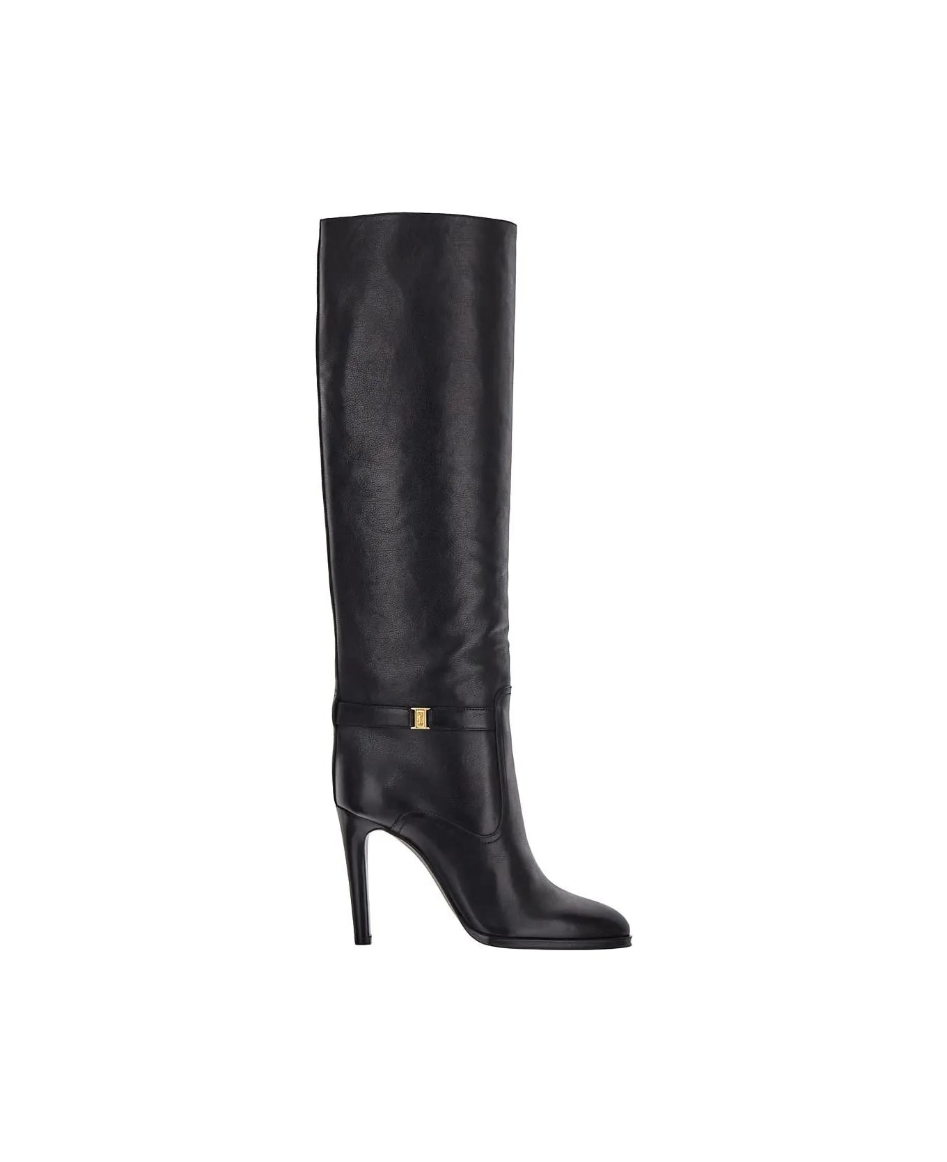 Saint Laurent boots in black grained leather with a stiletto heel, an almond toe, ankle strap with gold-finish Cassandre buckle, below-the-knee length and wide-leg.