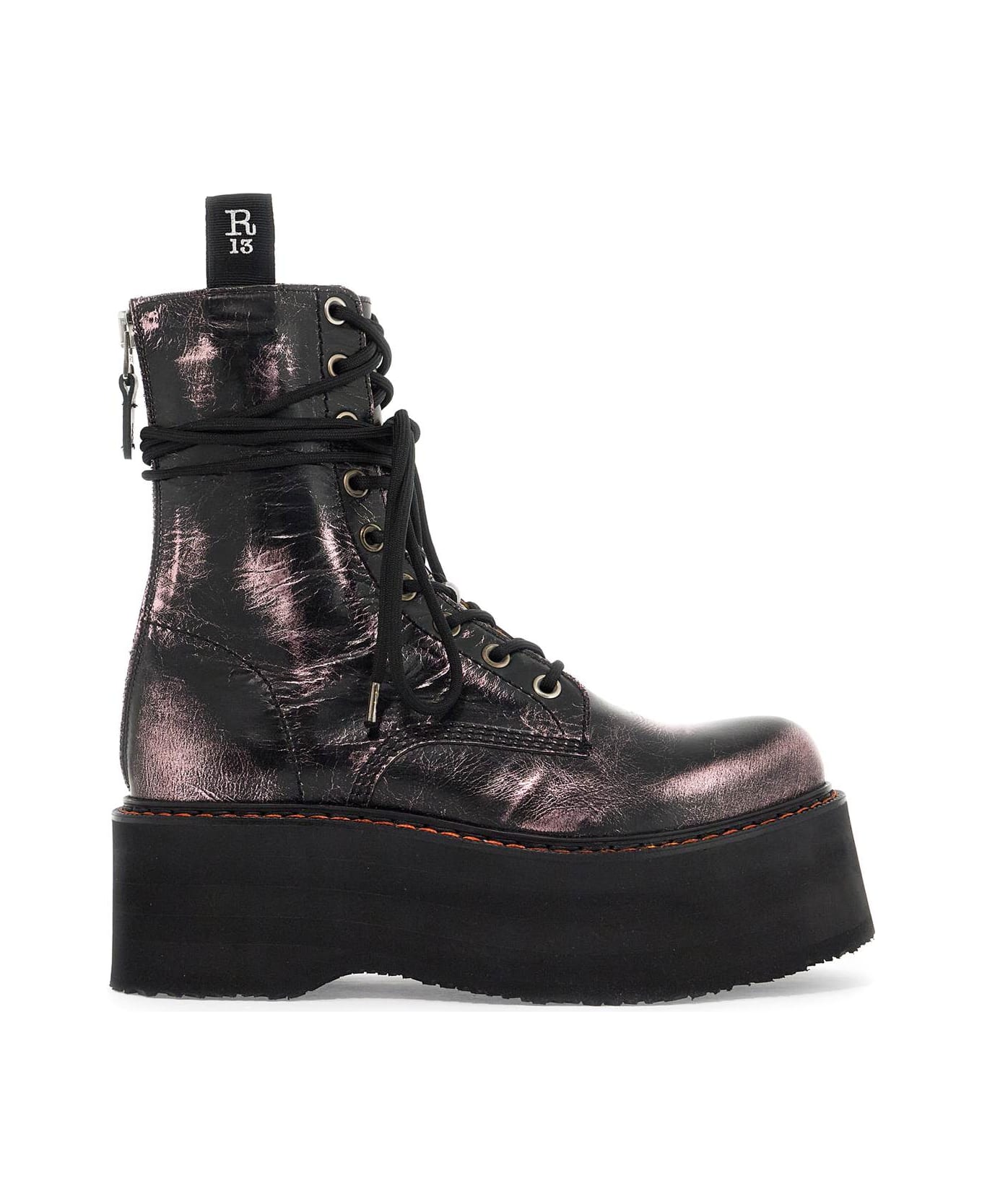 The R13 Double Stack boots have a used look and are made of leather with laminated shades. They feature a maxi platform and are secured with long laces, a double gros-grain logo strap, and a silver zip closure at the back. The interior is lined with leather and the sole is made of Vibram rubber.