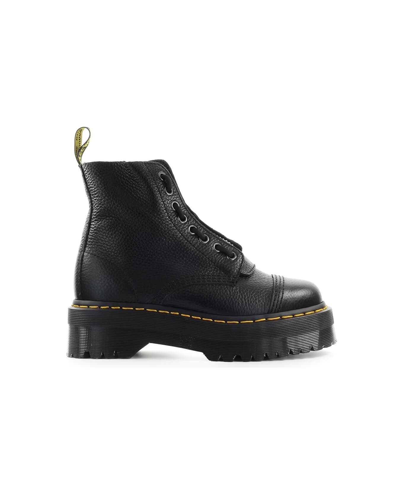 Sinclair combat boot by Dr. Martens made of black hammered leather with visible stitching. 8 eyelets, double fastener with laces and zip, platform rubber sole with air cushion and treaded bottom. Wedge heel height 4 cm, heel height 5 cm.
