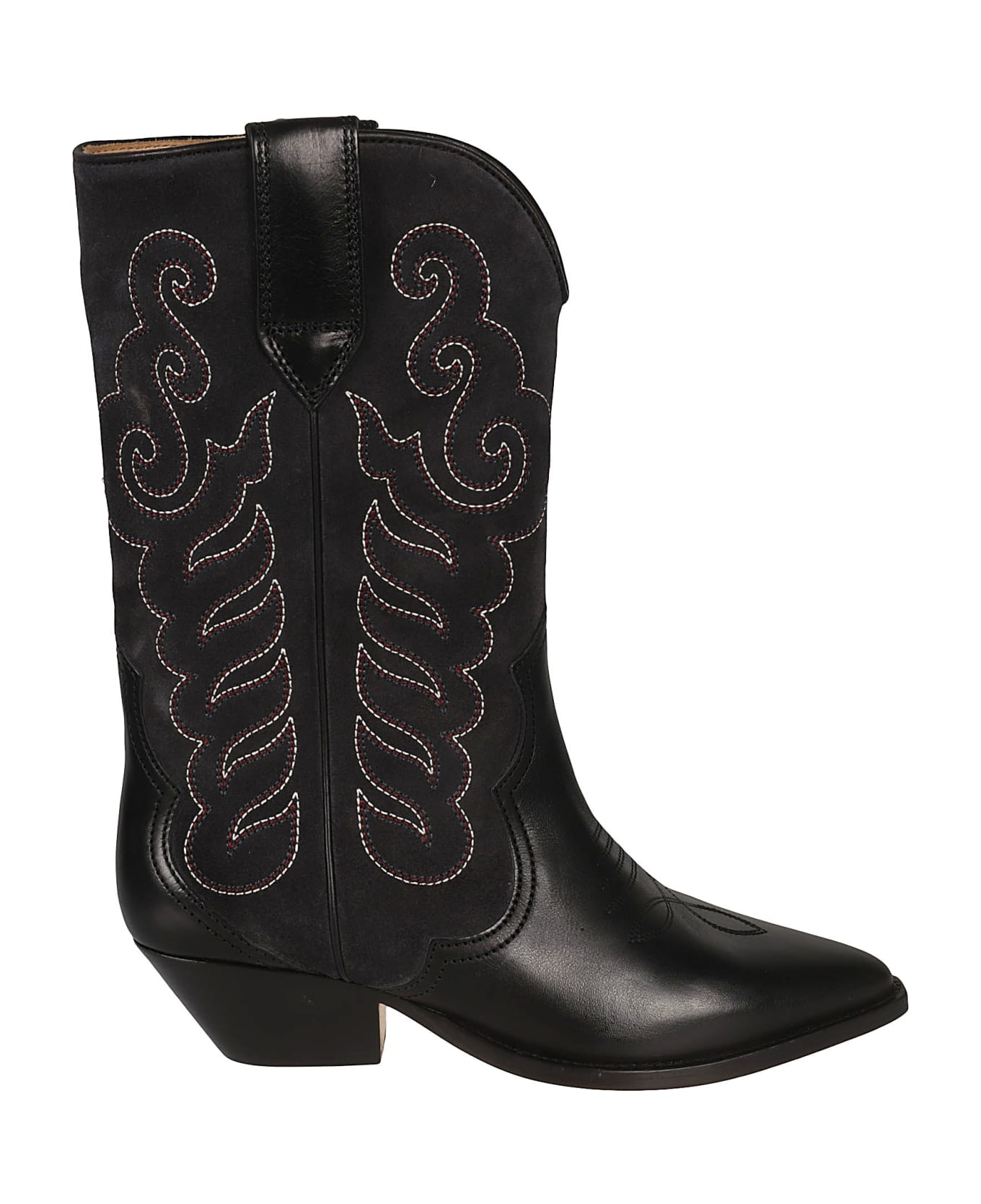 50mm embroidered-design leather boots from ISABEL MARANT featuring prussian blue, black, calf leather, calf suede, embroidered design, pull-tab at the heel, pointed toe, slip-on style, branded leather insole, low block heel and leather sole.