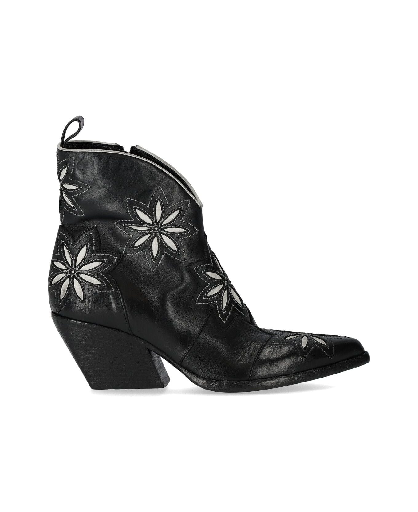 Blues Texan ankle boot by Elena Iachi made of black leather with contrasting embroidered flowers. Pointed toe, side zip fastening, leather lining and insole. Leather sole, heel height 7 cm.