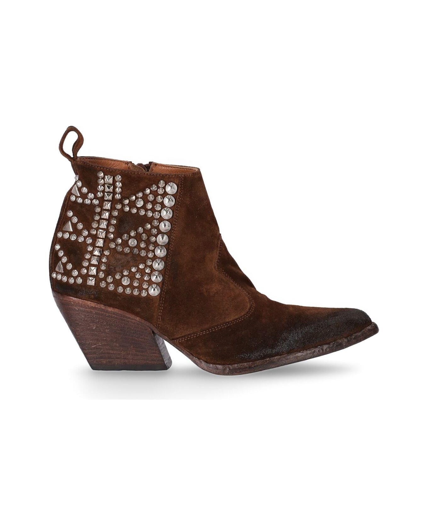 Texan ankle boot by Elena Iachi made of brown suede with vintage effect processing. Metal studs applied on the side, soft leather interior and zip closure. Leather sole, 7 cm heel height.