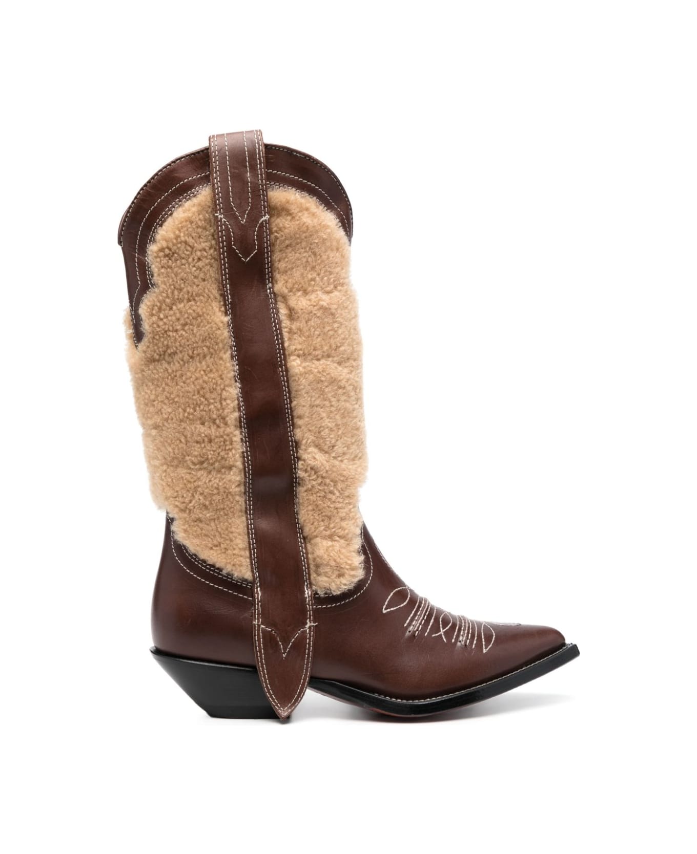 San Luis 50mm boots from Sonora featuring brown, decorative stitching, appliqué detail, pull-on style, branded leather insole, mid block heel and pointed toe.
