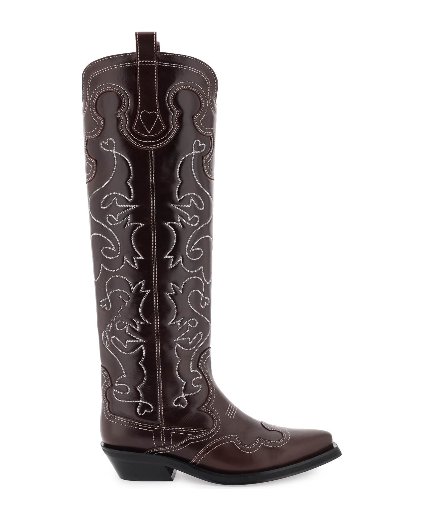 Ganni boots in smooth calf leather, characterized by the western-inspired silhouette with leather slanted heel and contrasting topstitched detailing. Side loop tabs, leather lining and insole, leather sole with rubber inlays. Composition: 100% calf leather