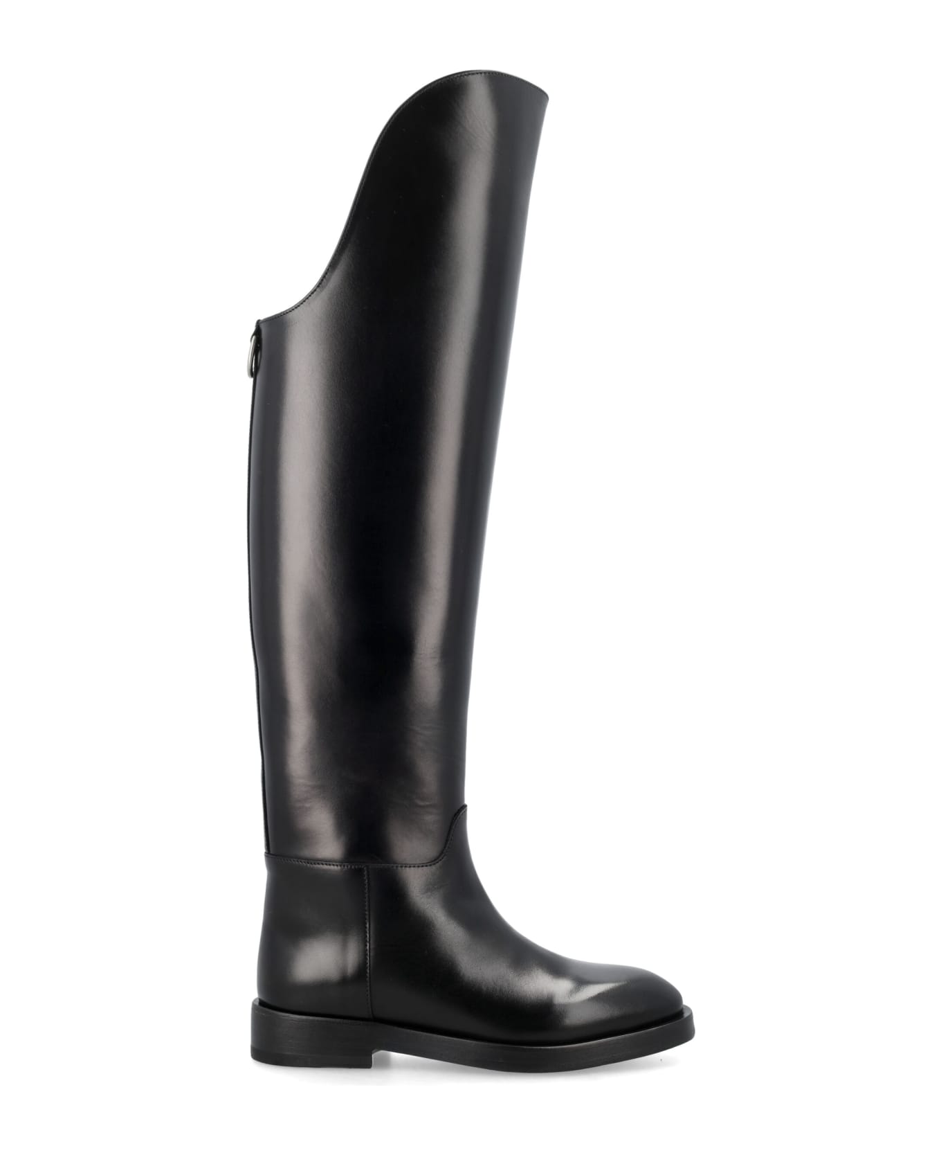 Smooth Leather Equestrian High Boots By Durazzi Milano. Featuring: Over-the-knee Height Logoed Ring Detail At Back Asymmetric Top Round Toe Leather Sole Heel 3cm
