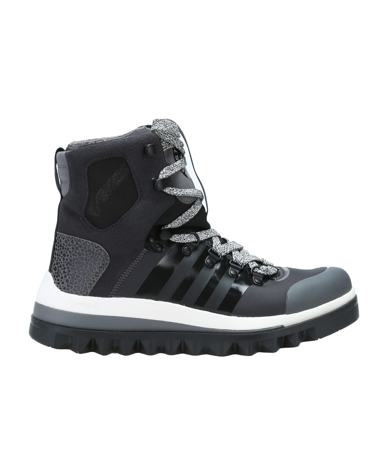 Core Black And Granite Eulampis Boots By Adidas By Stella Mccartney. Featuring: - Round Toe; - Lace-up Front Fastening; - Logo Patch At The Tongue; - Rear Pull Tab; - Ankle Length; - Ridged Rubber Sole.