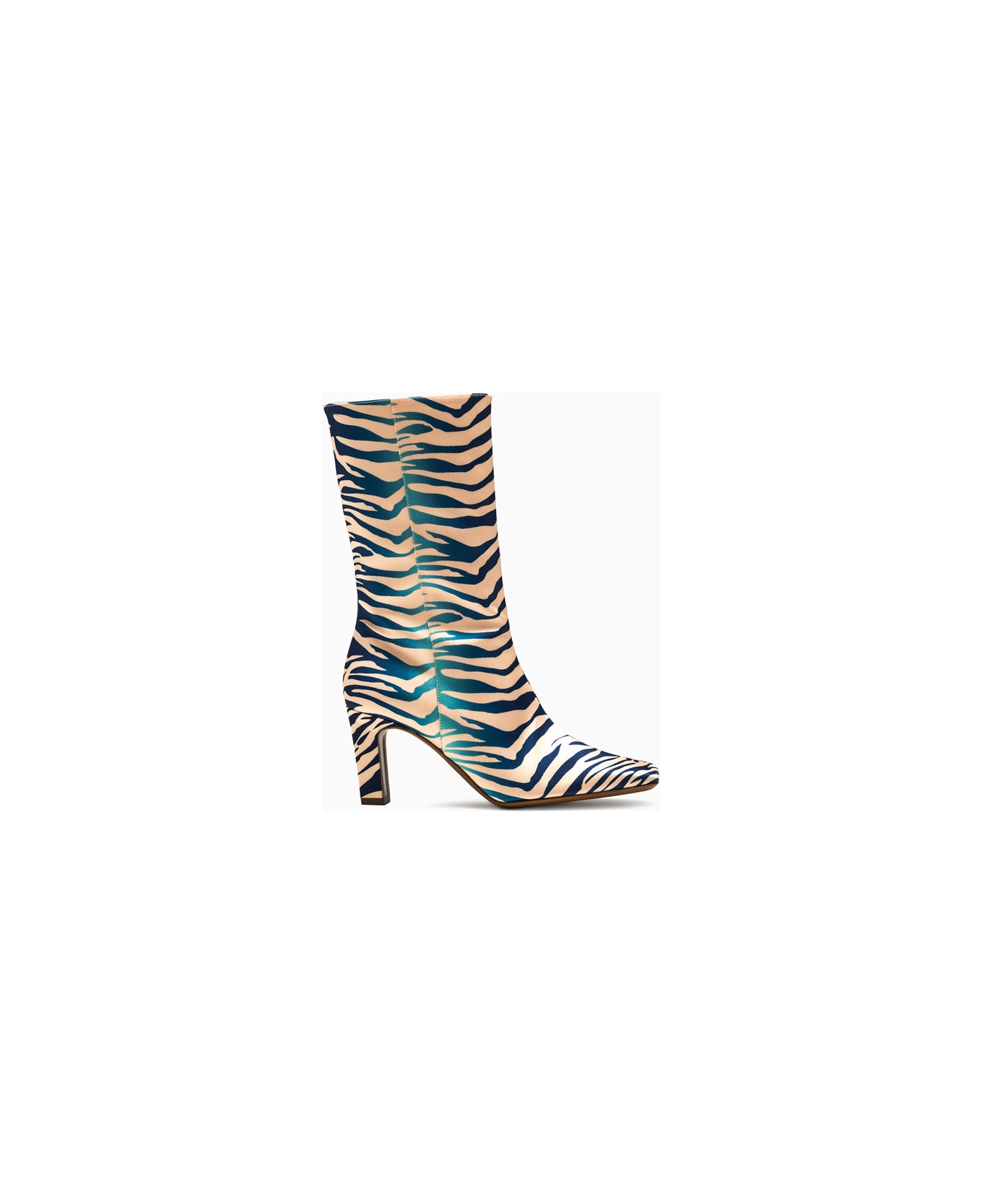 made in italy ankle boots. animalier print fabric upper. straight toe tip. color matched covered block heel. side closure with color matched zip. leather lining. sole in natural leather. height of heel: 8 cm. height of leg: 20 cm.