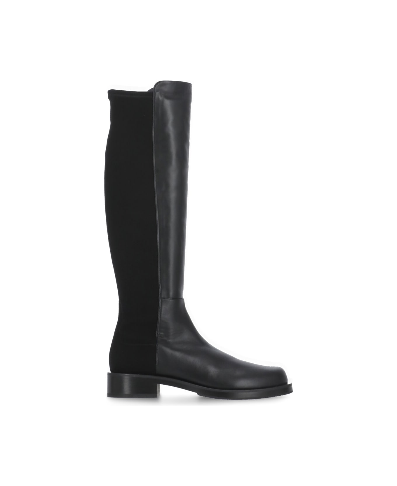 - Black Stuart Weitzman leather and fabric boots for woman - Round toe - Leg height: 45 cm - Heel: 3 cm