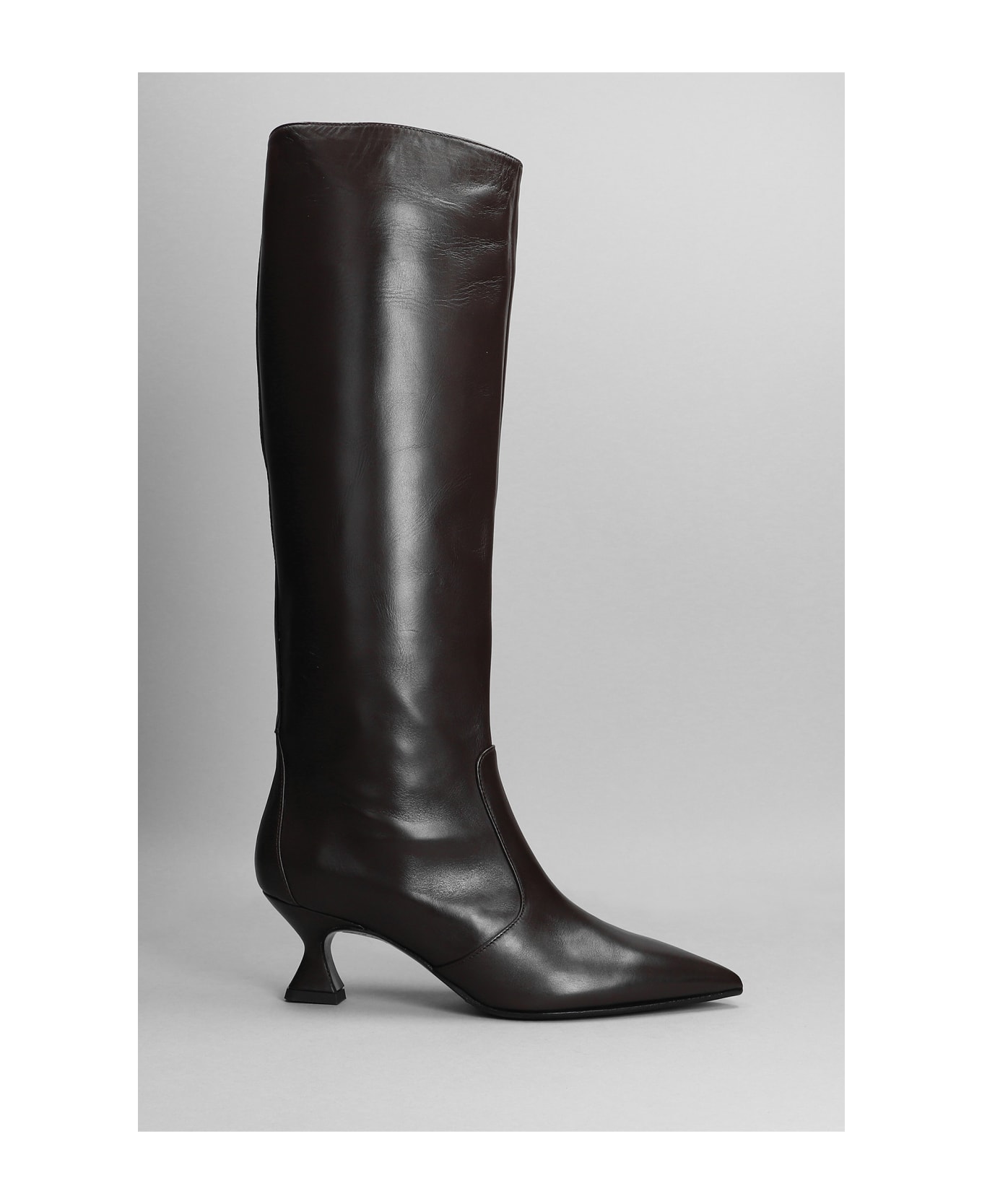 High heels boots in dark brown leather, pointed toe, slip on, straight leg, leather sole, 60 mm heel, Made in Italy, 100% leather