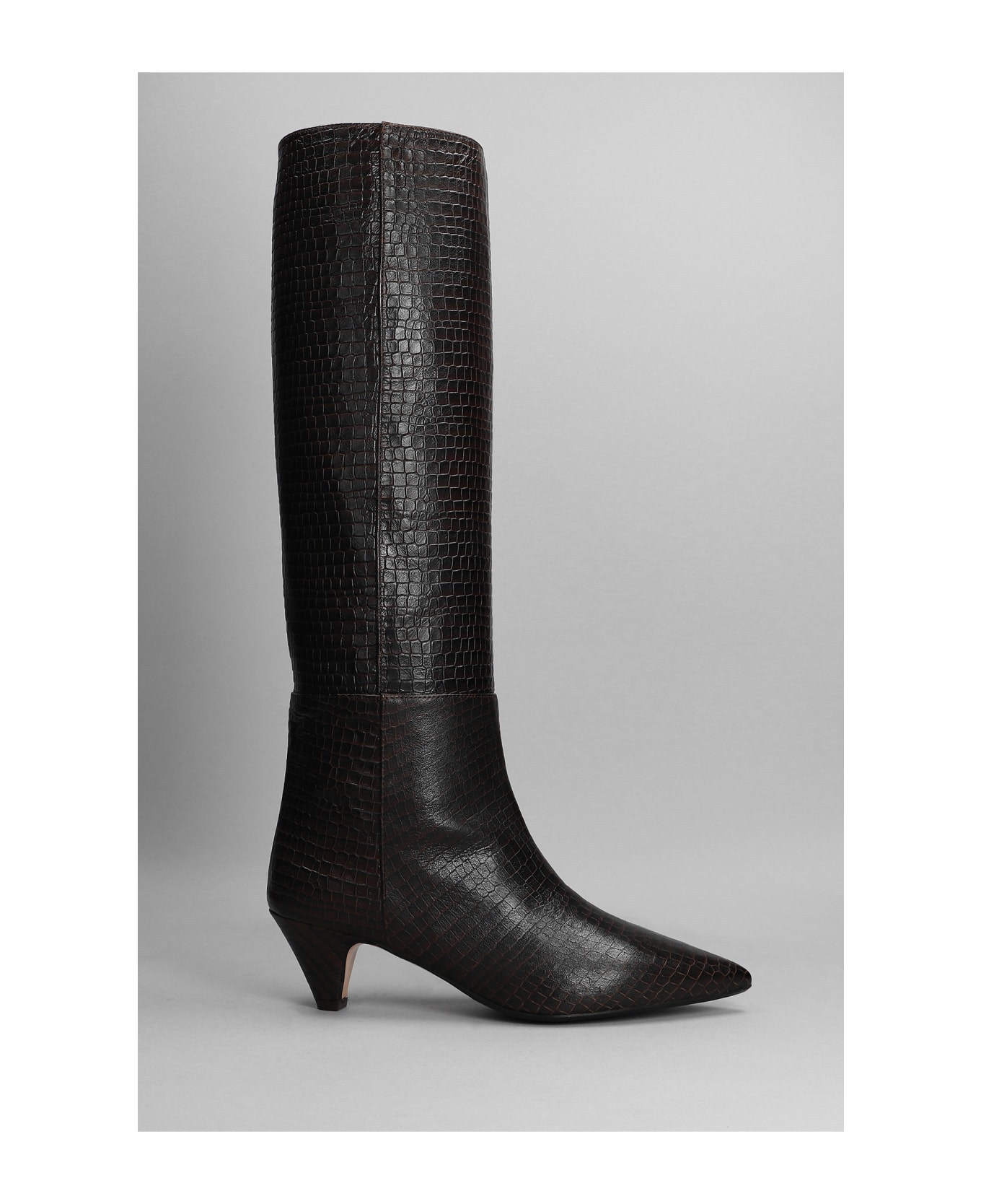 High heels boots in dark brown leather, pointed toe, slip on, straight leg, crocodile print detail, 60 mm heel, Made in Italy, 100% leather