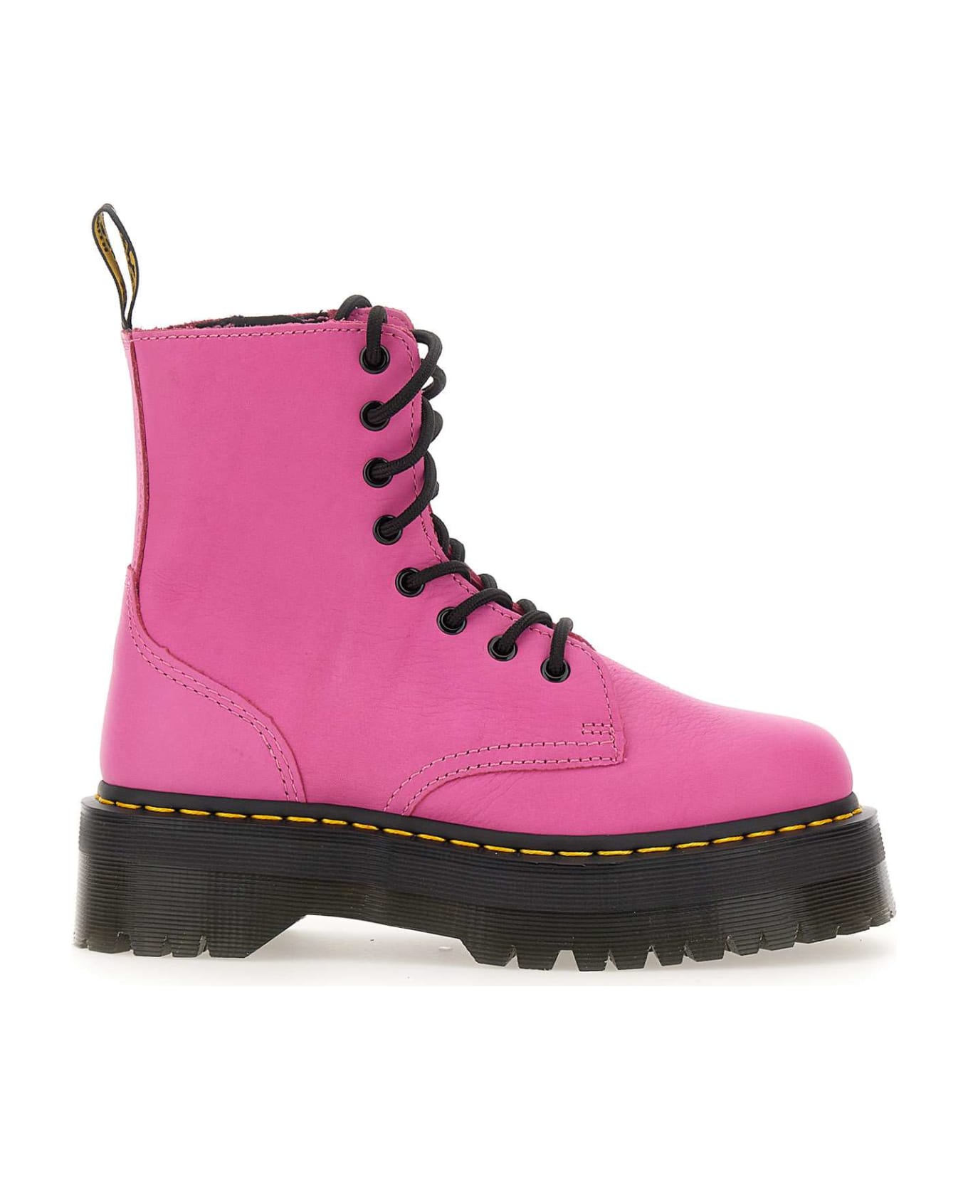 Dr. Martens 'Jadon' combat boots tumbled effect leather, fuchsia colour, closure with 16 eyelets laces and side zip, yellow and black logo puller on back, classic yellow stitching on hem, round toe, logoed zip puller, perfect for a casual look trendy, Platform sole in 4cm high rubber.