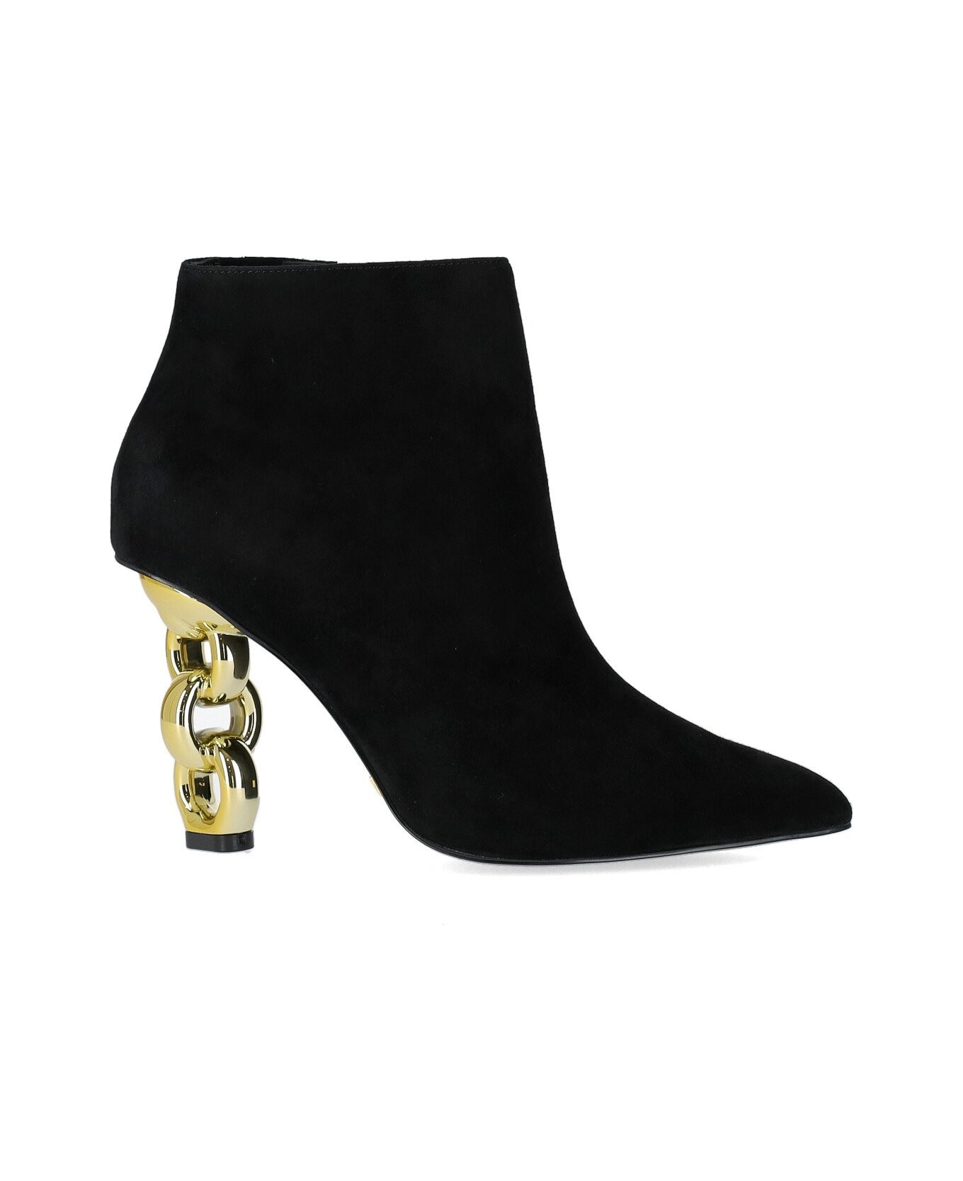 Kat Maconie Toni ankle boot made of black suede with golden sculpture heel. Tapered toe, leather interior and leather sole. Height 9. 5 cm.