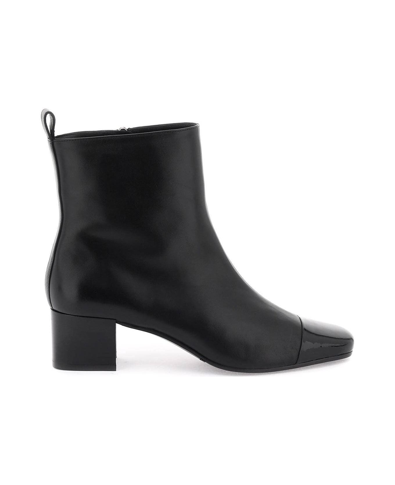 Carel ankle boots crafted in smooth leather and characterized by patent leather toe. They feature side zip closure, back pull-tab, wide heel, leather interior and rubber sole.