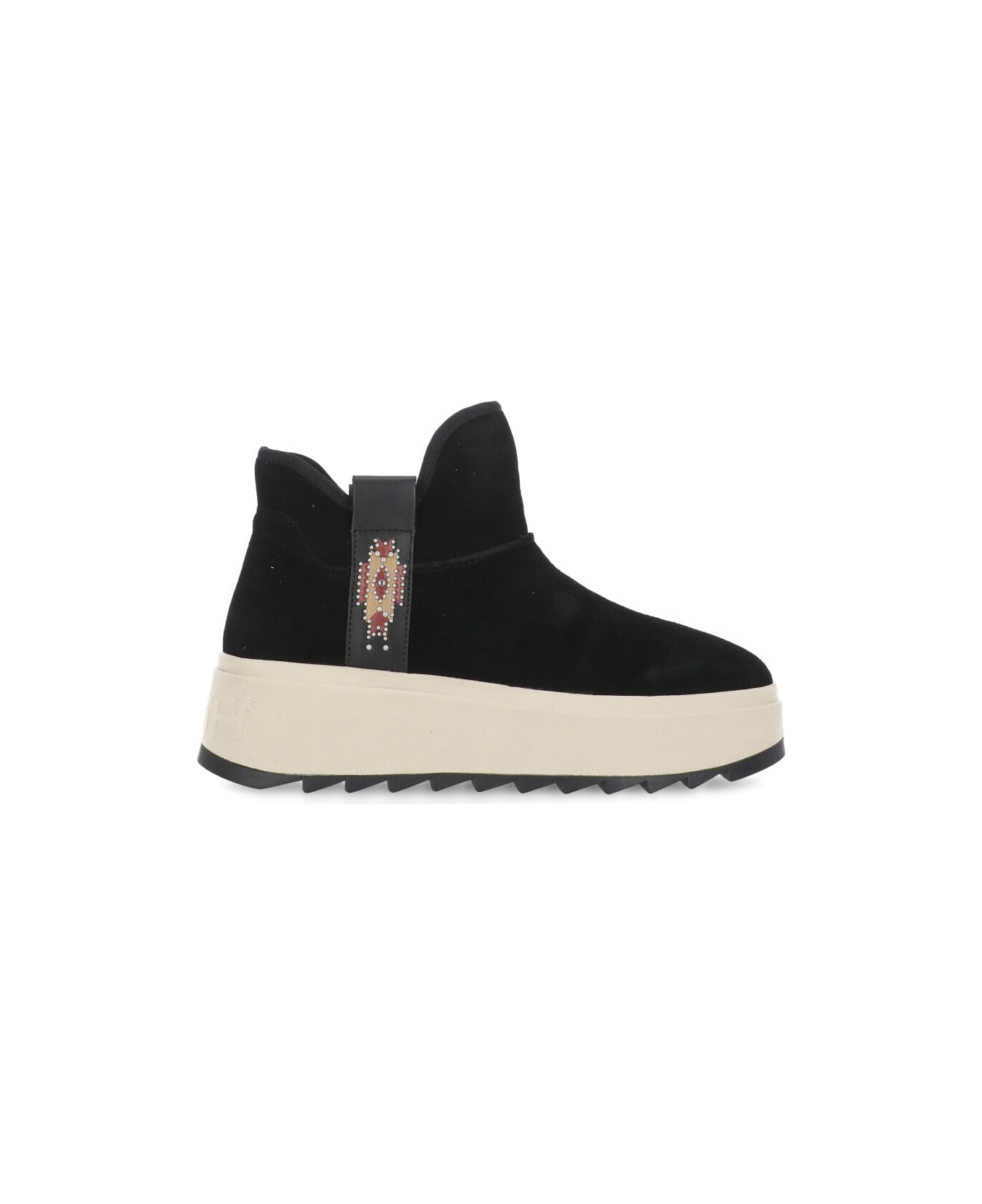 - Black Ash suede leather ankle boots for woman - Round toe - Two side bands with studs - Raised rubber sole (6 cm) - Rear logo