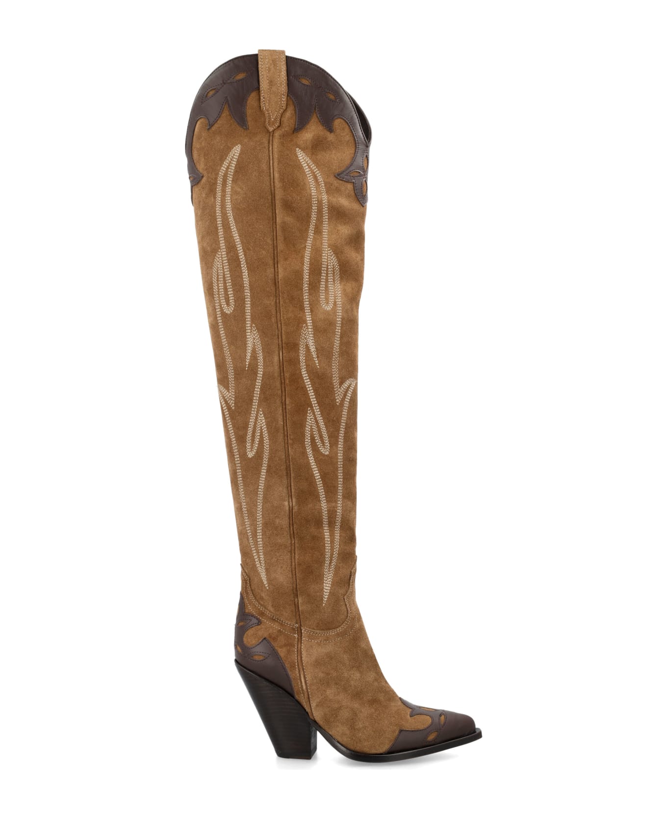Suede Melrose Over The Knee Boots By Sonora. Featuring: Bicolor Design Over The Knee Height Cowboy Design Cigar Suede Body Caffe Calf Inserts Point Toe Leather Sole Leather Lining And Insole Heel: 9 Cm