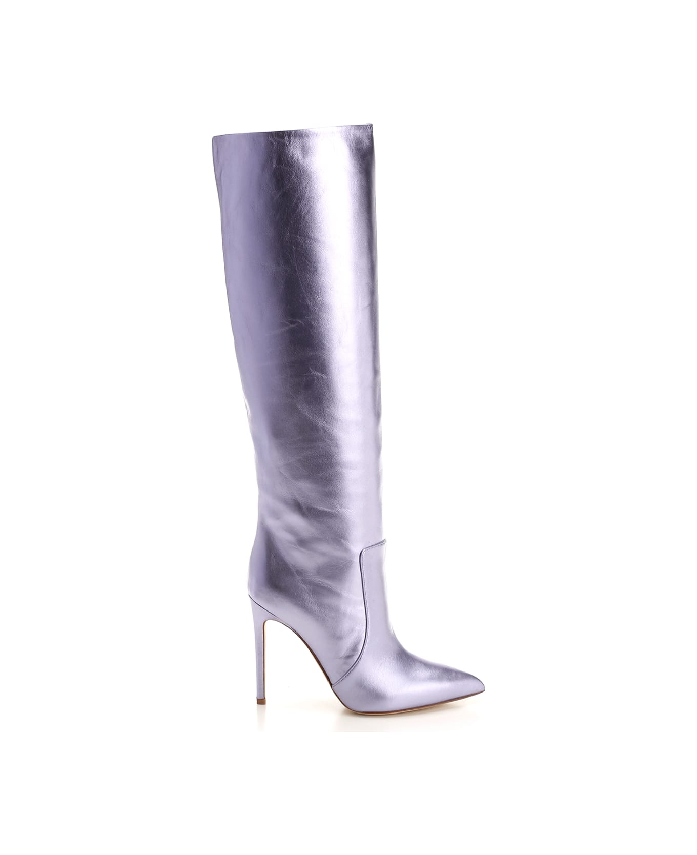 "Stiletto boot" from Paris Texas in metallic lilac leather, tube leg, tapered toe, high stiletto heel. Composition: UPPER 100% BOS TAURUS LINING 100% OVIS ARIES SOLE 100% CALF