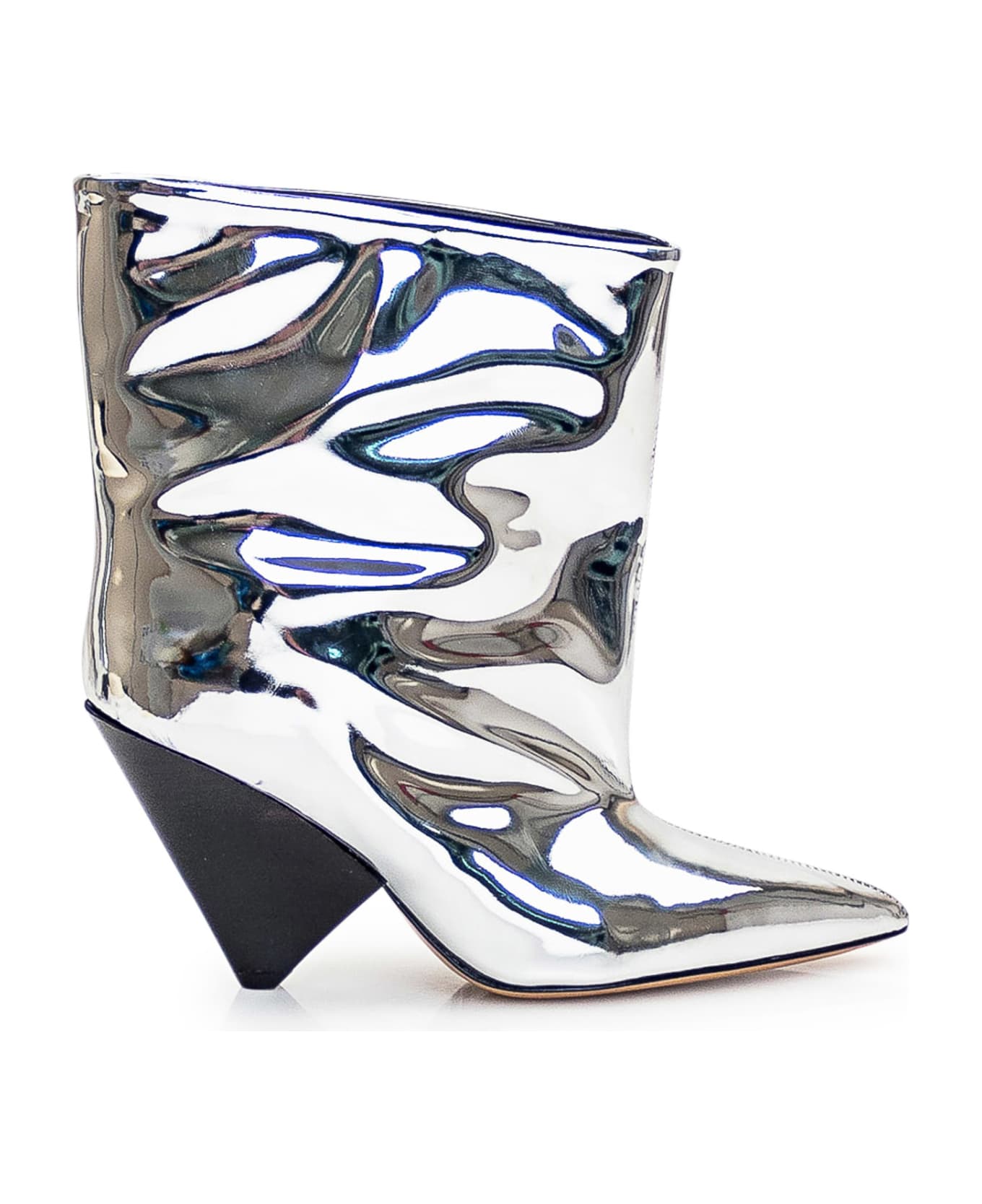Low boot with mirror effect. Tapered heel. Slip-on. Logo on the sole.