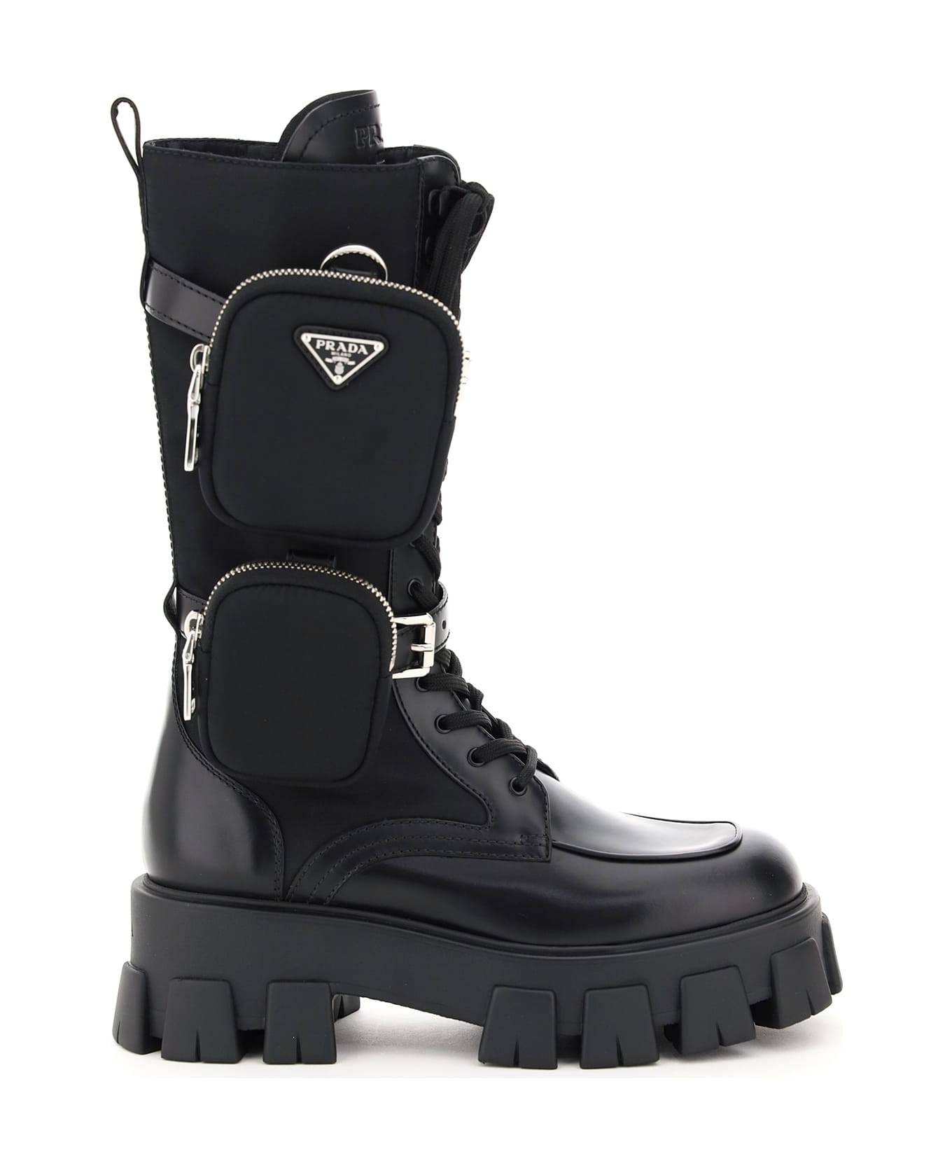 Monolith boots by Prada in leather and nylon fabric featuring removable straps with silver-tone metal buckles and removable zip pouches in nylon fabric with loop with snap button. Triangle logo in metal and enamel, eyelets and hooks in painted metal, side zip closure, logo embossed on the tongue. Leather interior, oversized rubber lug sole with rear logo.