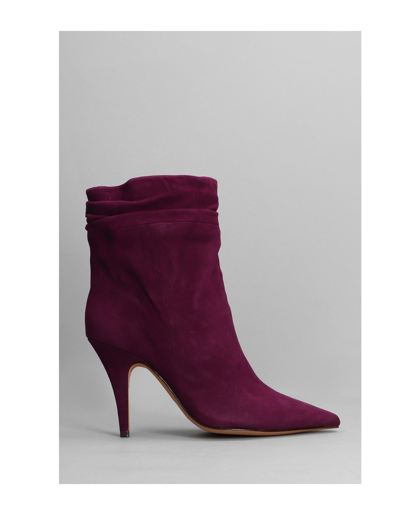 Olivia slouch High heels Ankle boots in Viola suede, pointed toe, draped, Made in Brazil, heel 90 mm, 100% suede