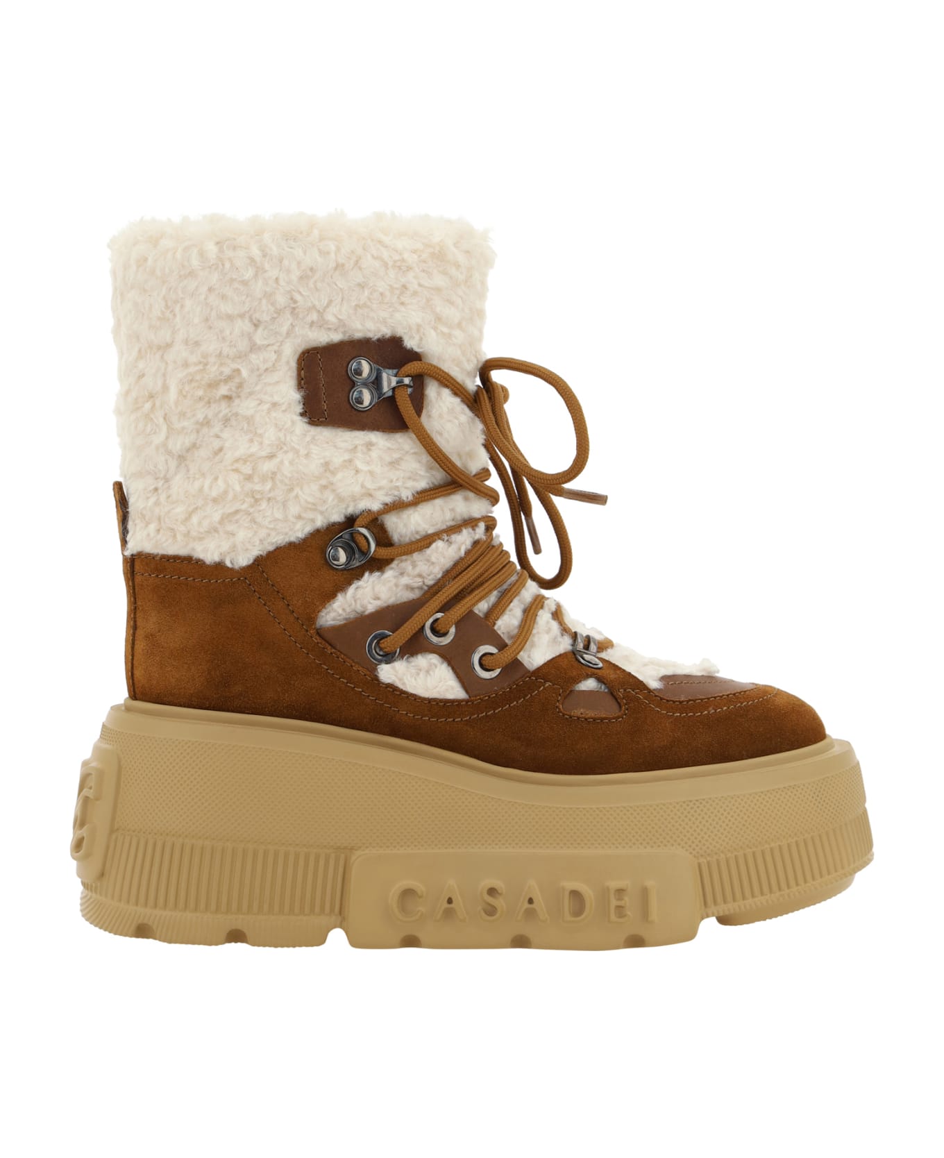 Leather polacco boots by casadei, soft faux leather upper design, oversized model, knurled platform sole, iconic brand signature embossed on side panel, front closure via laces, shearling ankle strap. Composition: 100% % Calf Leather Bos Taurus, 100% % Rubber