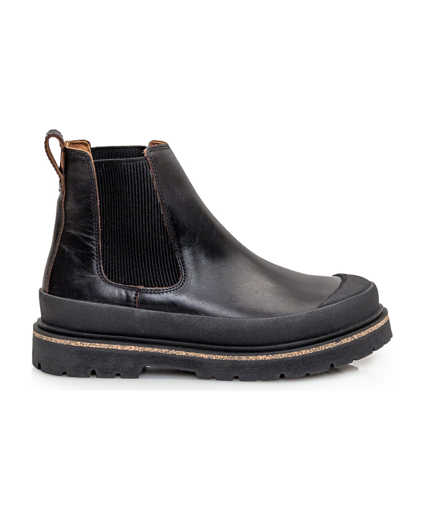Black leather ankle boot. Slip-on. Stretch insert. Logo on the side.