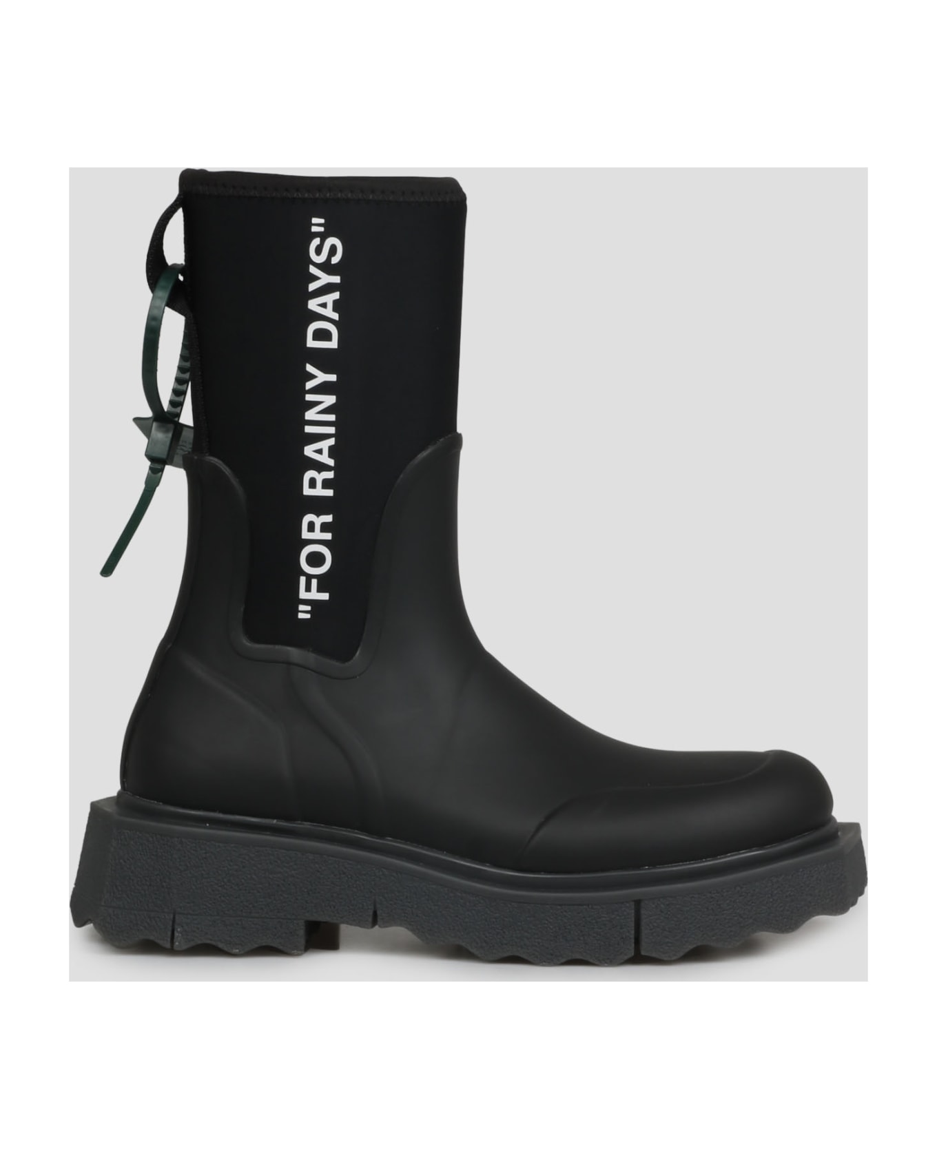 Off White rain boots, in rubber and neoprene. - FOR RAINY DAYS print in contrast - Square toe - Back ring with iconic logoed band - Sponge-effect rubber sole - Made in Indonesia - Rubber