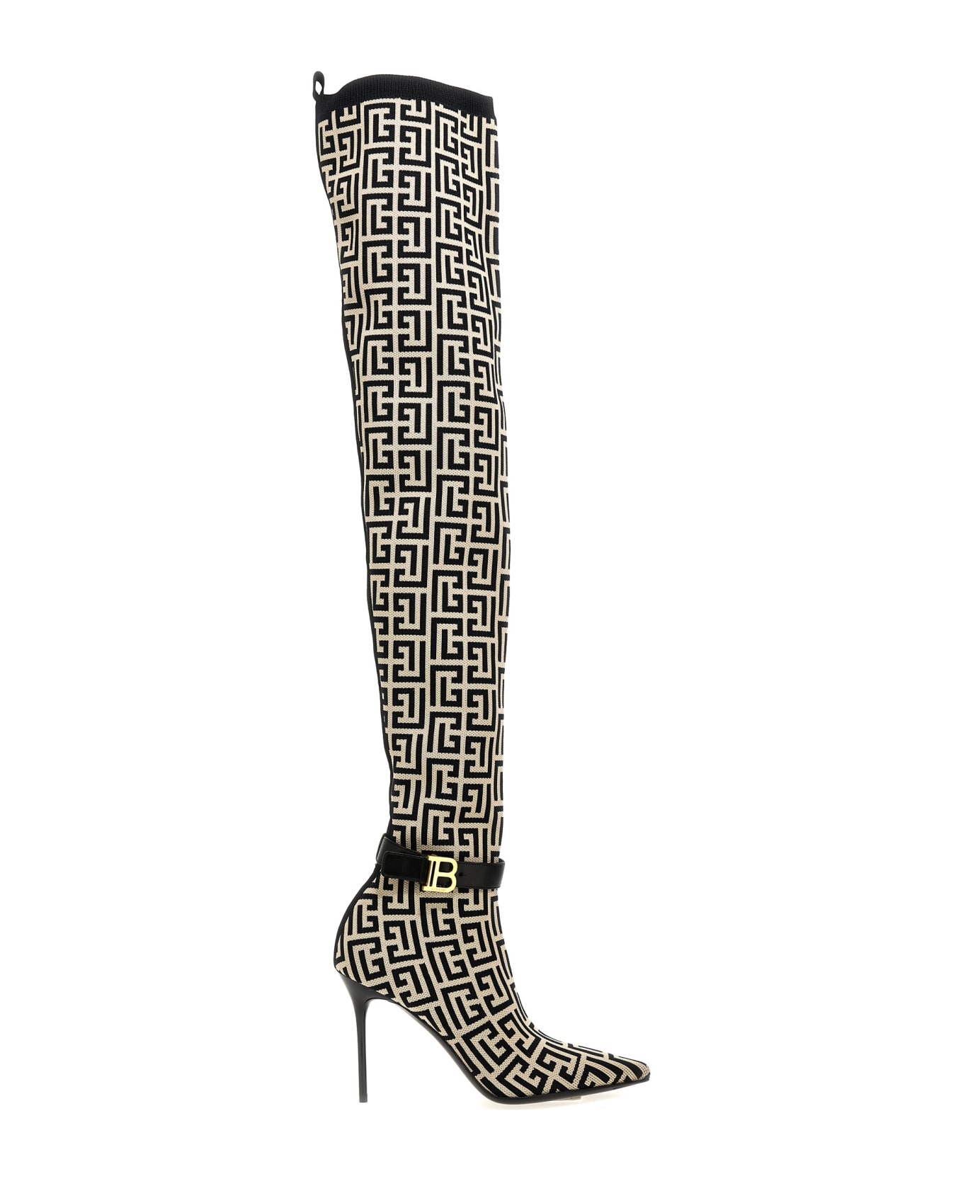 Raven' knit boots with all over logo pattern, leather strap with metal logo and stiletto heels. Composition: