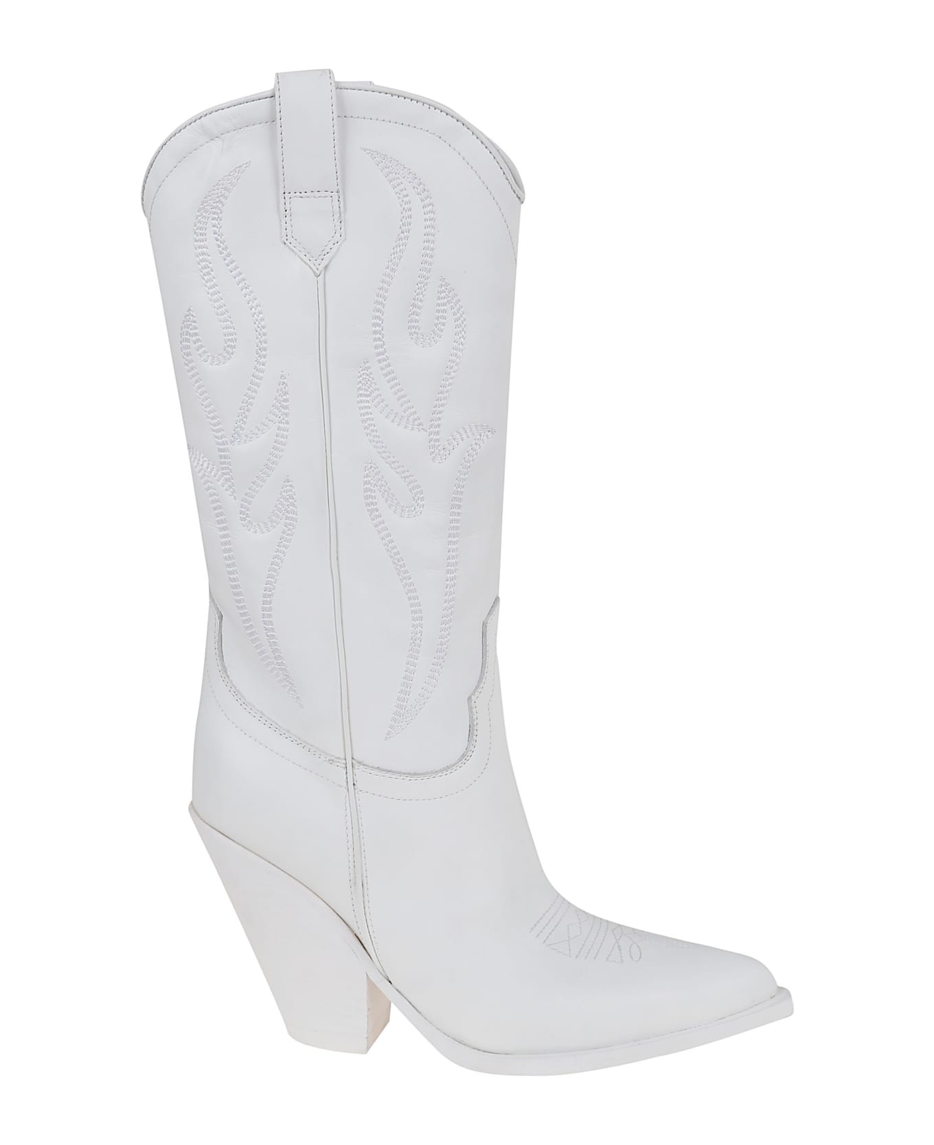 Santa Fe boot in smooth calfskin BY SONORA. Inspired by classic cowboy boots, pointed toe and block heel. The shaft and upper are decorated with beautiful tone-on-tone embroidery.
