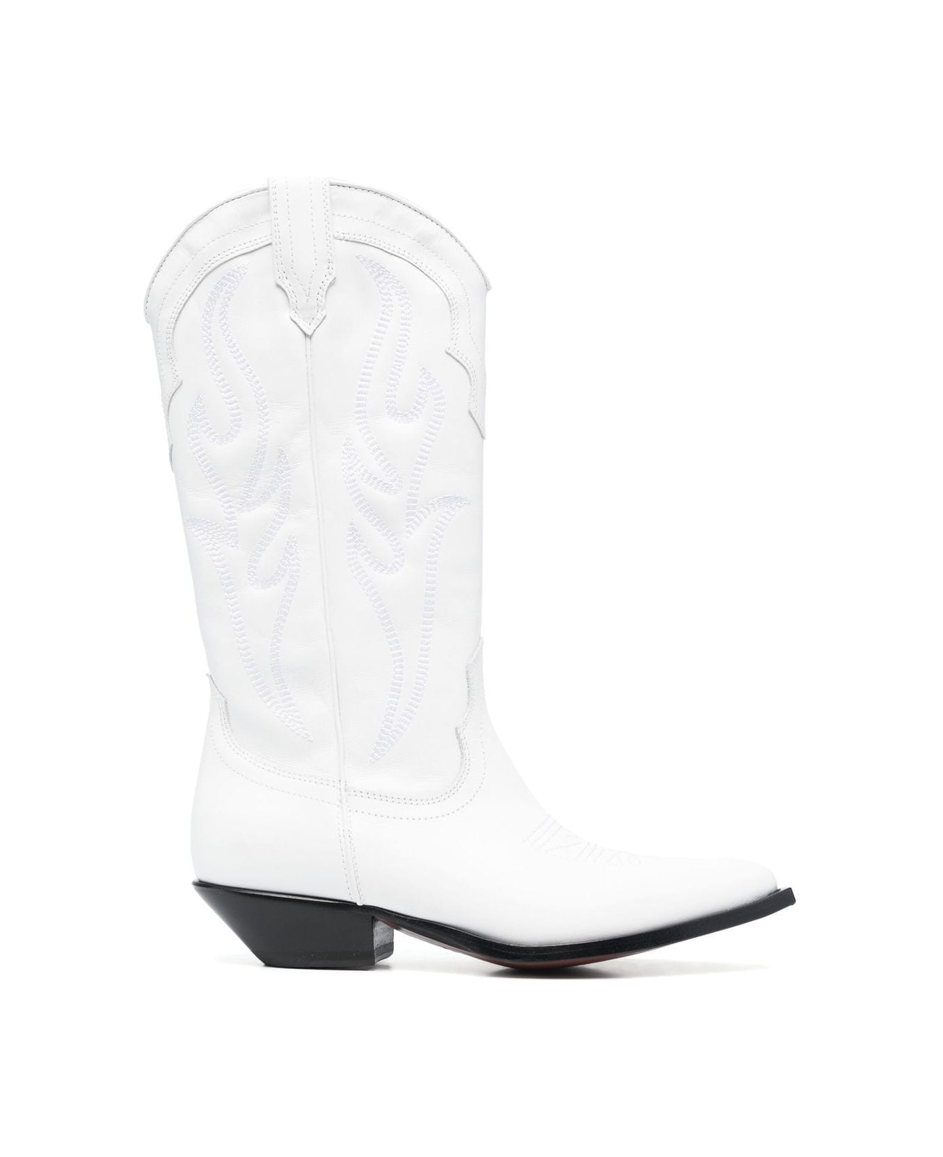 Santa Fe western-cowboy boots from Sonora featuring white, calf leather, Western style, all-over motif embroidery, low block heel, pointed toe, mid-calf length and tonal design.