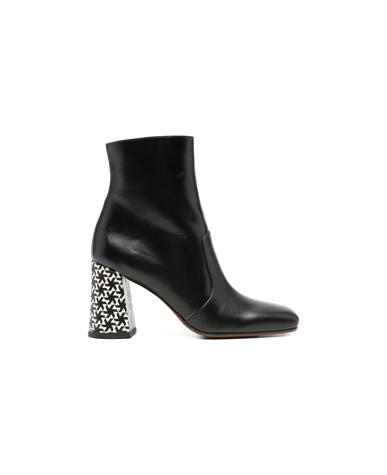 black calf leather geometric block heel zip fastening square toe patterned heel insert