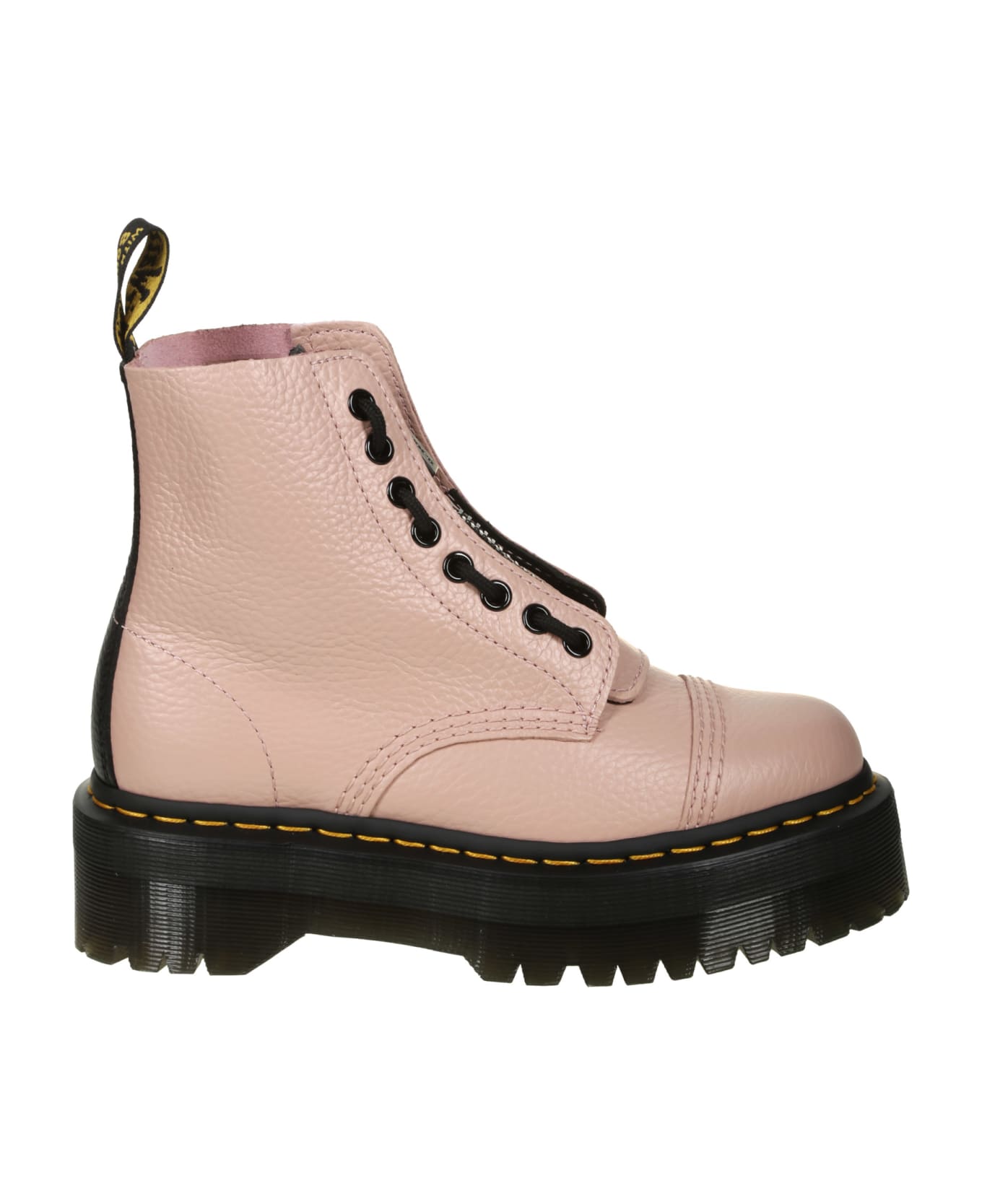 Dr. Martens Pink leather boot, 8-hole lacing, yellow stitching, black leather insert, PVC sole. Composition: 100% Leather