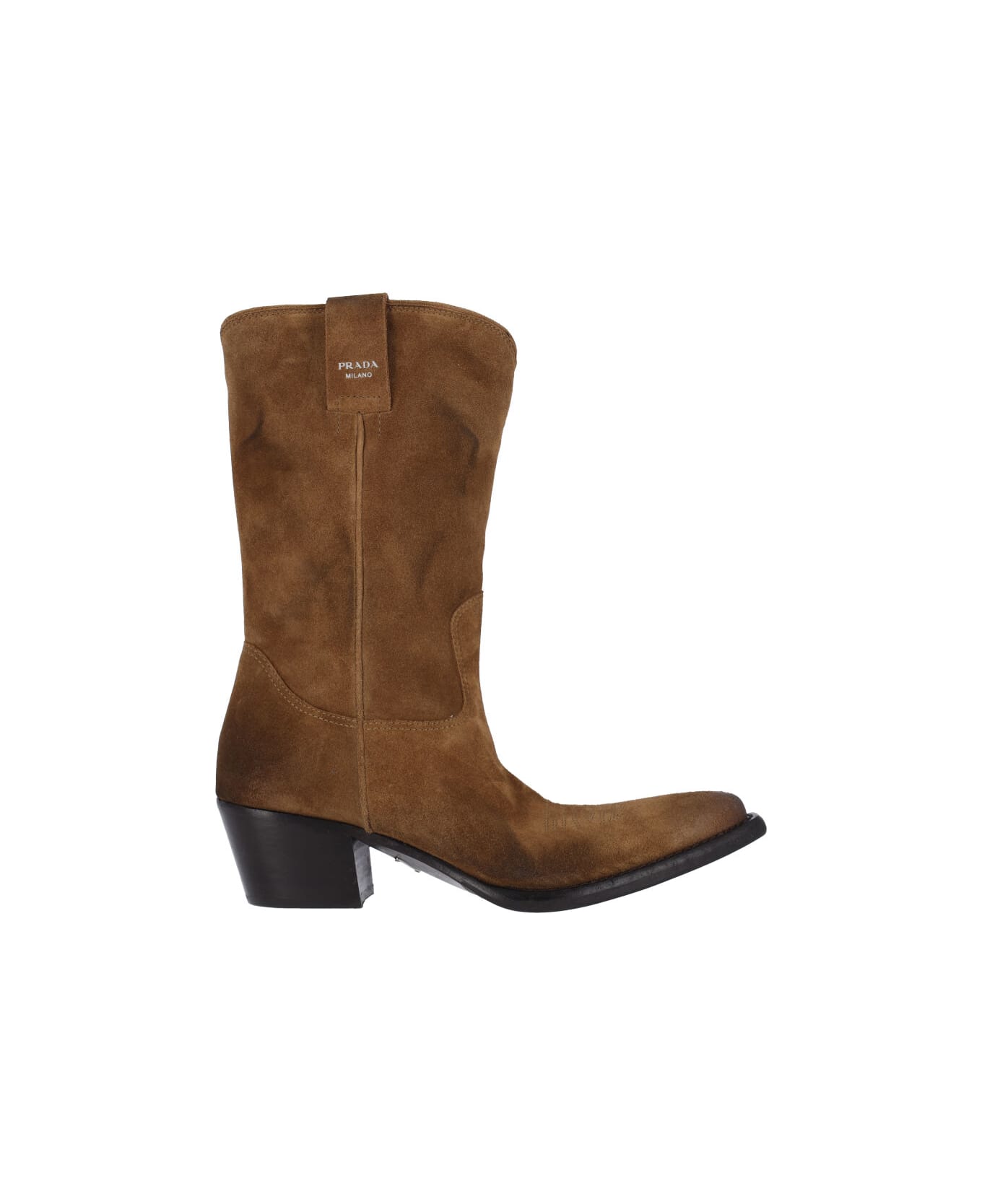 Prada suede ankle boots, brown, pointed toe, stitching pattern, side top tabs, embossed silver logo detail, square heel, slip-on fit, leather sole. Composition: 100% Leather