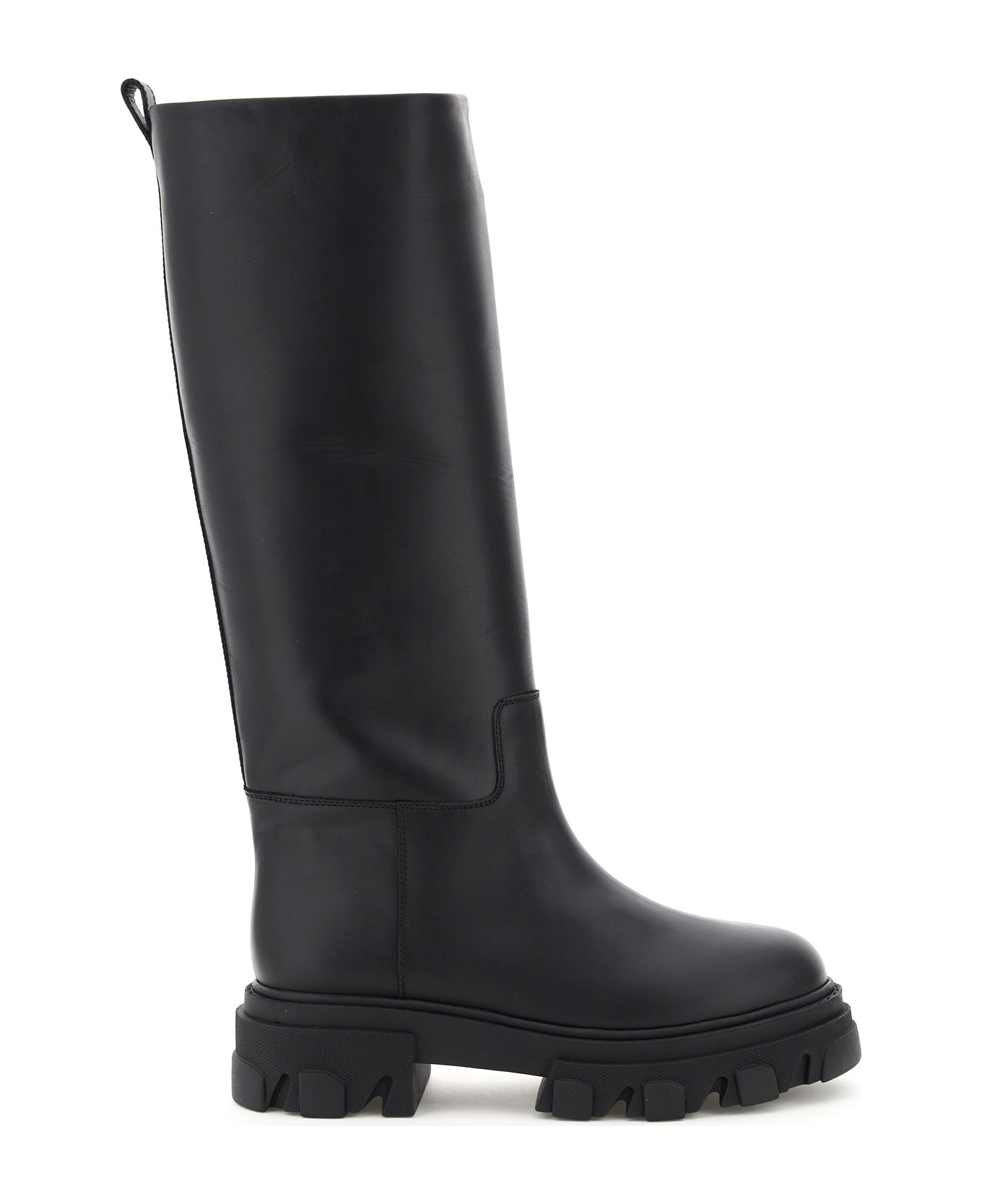 Tubular leather combat boots by Gia x Pernille Teisbaek with back loop, leather interior, oversized rubber lug sole.