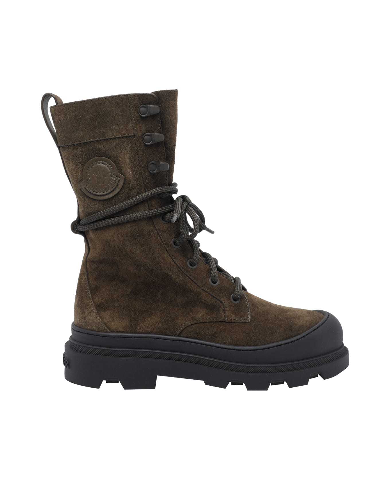 Moncler brown Vera high top ankle boots, lace closure, suede upper and rubber sole, lateral patch logo, tone sur tone