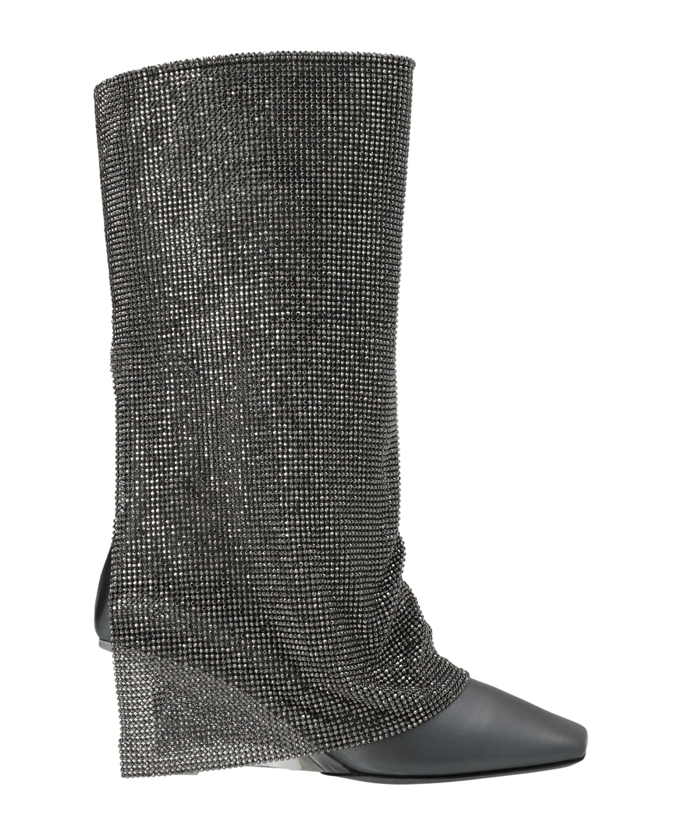 Virginia' leather boots with mesh and sequin detail, pointed toe and a sculpted heel in a transparent plastic material. Composition: