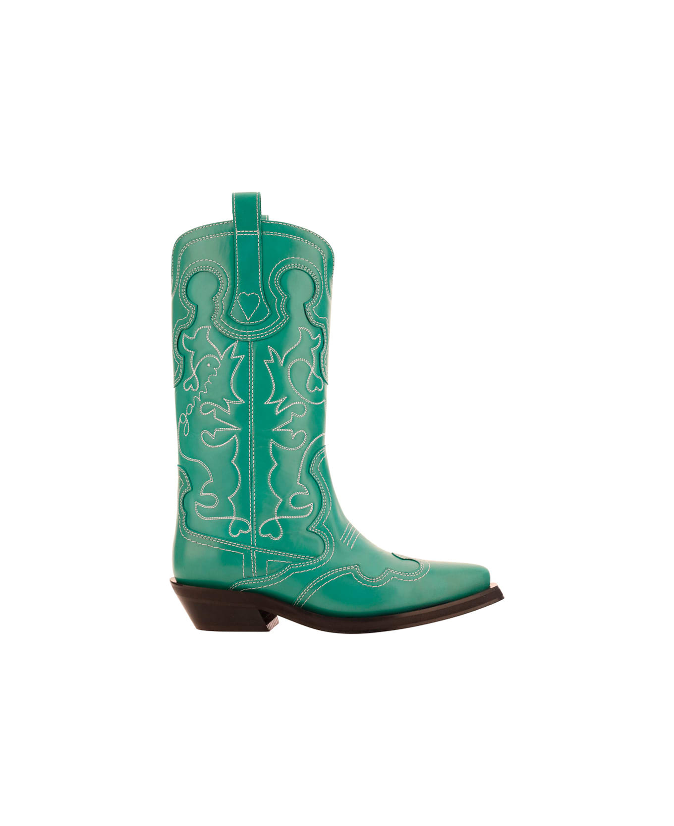 Calfskin western boots by ganni, glossy leather design, mid-leg texan style, almond toe, slight chunky heel, stitched pattern embroidery on side panels. Composition: 100% % Calf Leather Bos Taurus, 100% % Calf Leather Bos Taurus