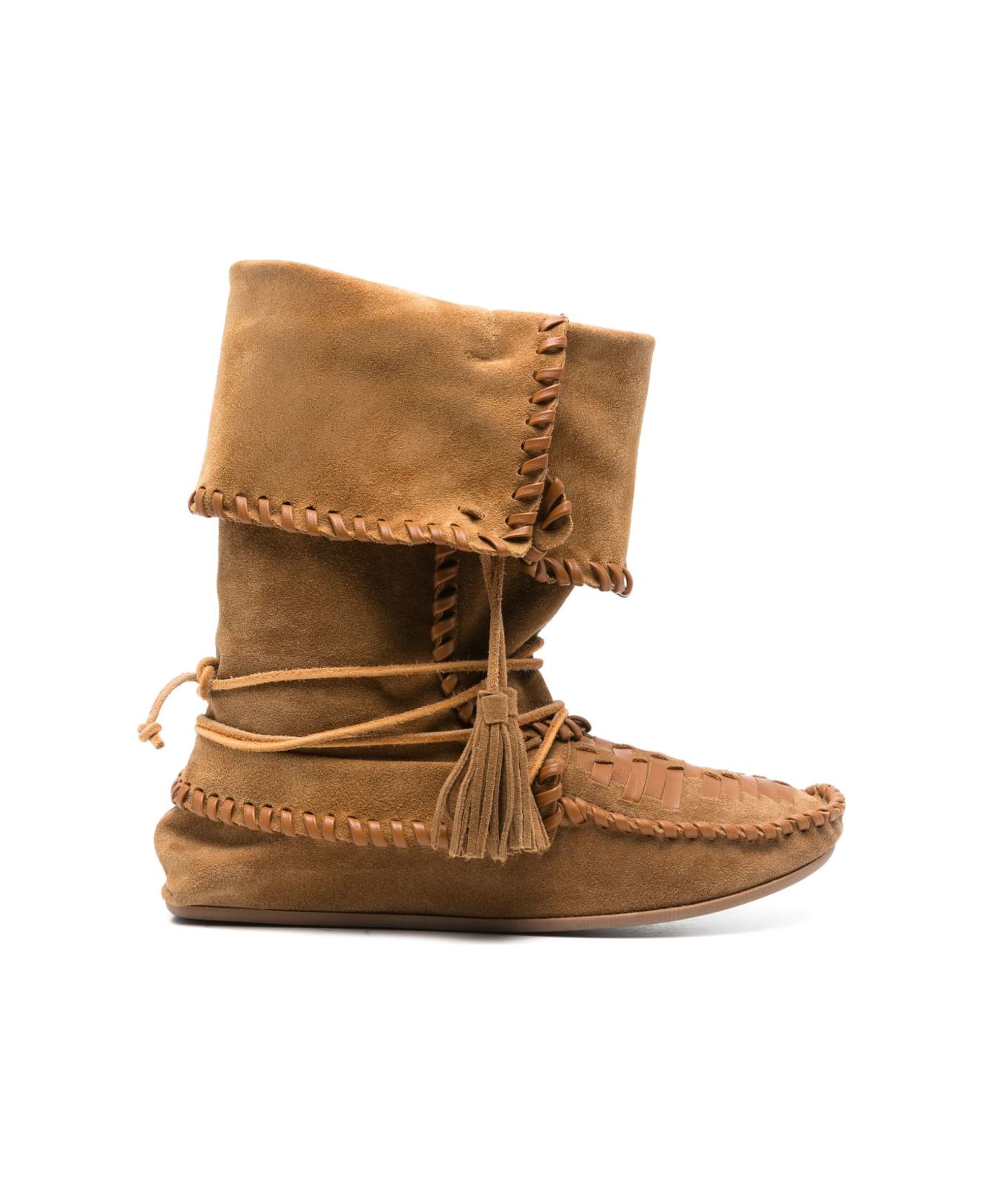 camel brown calf suede leather trim strap fastening ankle-length layered details whipstitch trim tassel detail decorative stitching moc stitching almond toe branded leather insole unlined rubber sole Composition: Outer: Calf Suede, 100%