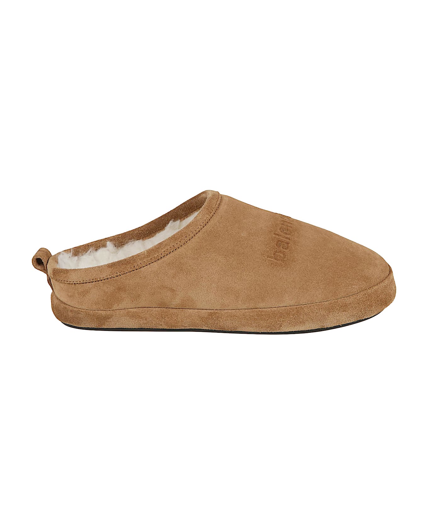Alaska Slipper in beige split calfskin and off white synthetic material. Split calfskin, wool, polyester and acrylic Slipper Round toe Open at back Balenciaga logo on the upper Tone-on-tone sole and insole Composition: 100% Calf