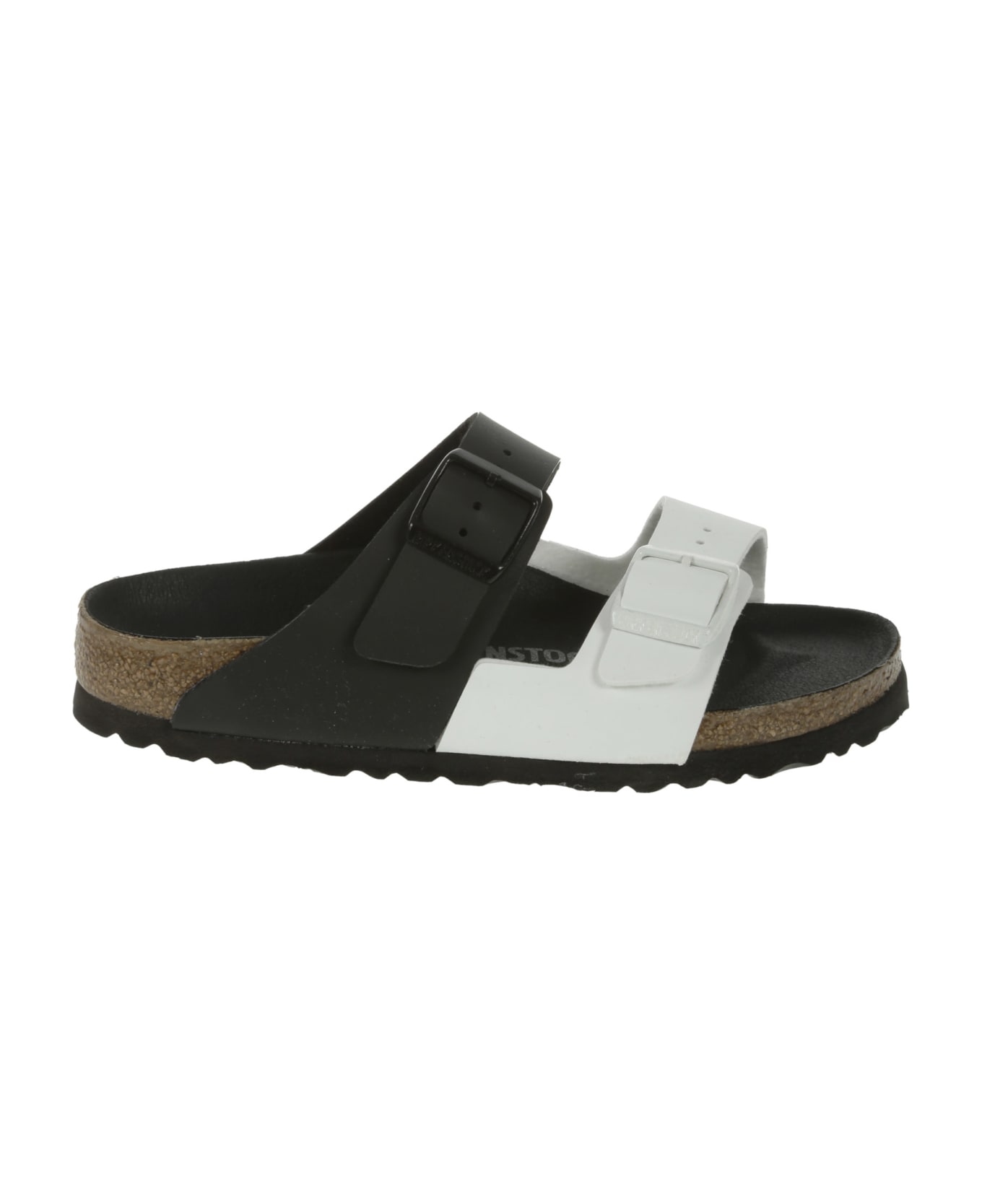 Birkenstock Sandal in black and white birko flor, adjustable bands with metal buckles, rubber sole, suede insole, logo detail.