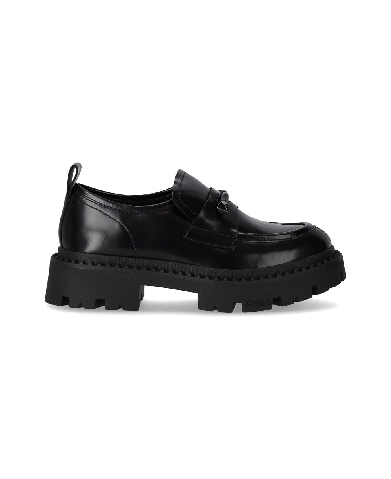 Genial Jack loafer by Ash made of black brushed leather. Logo detail on the front, lining and insole in leather and lug sole in black rubber profiled by rubberized micro studs. Height 5 cm.