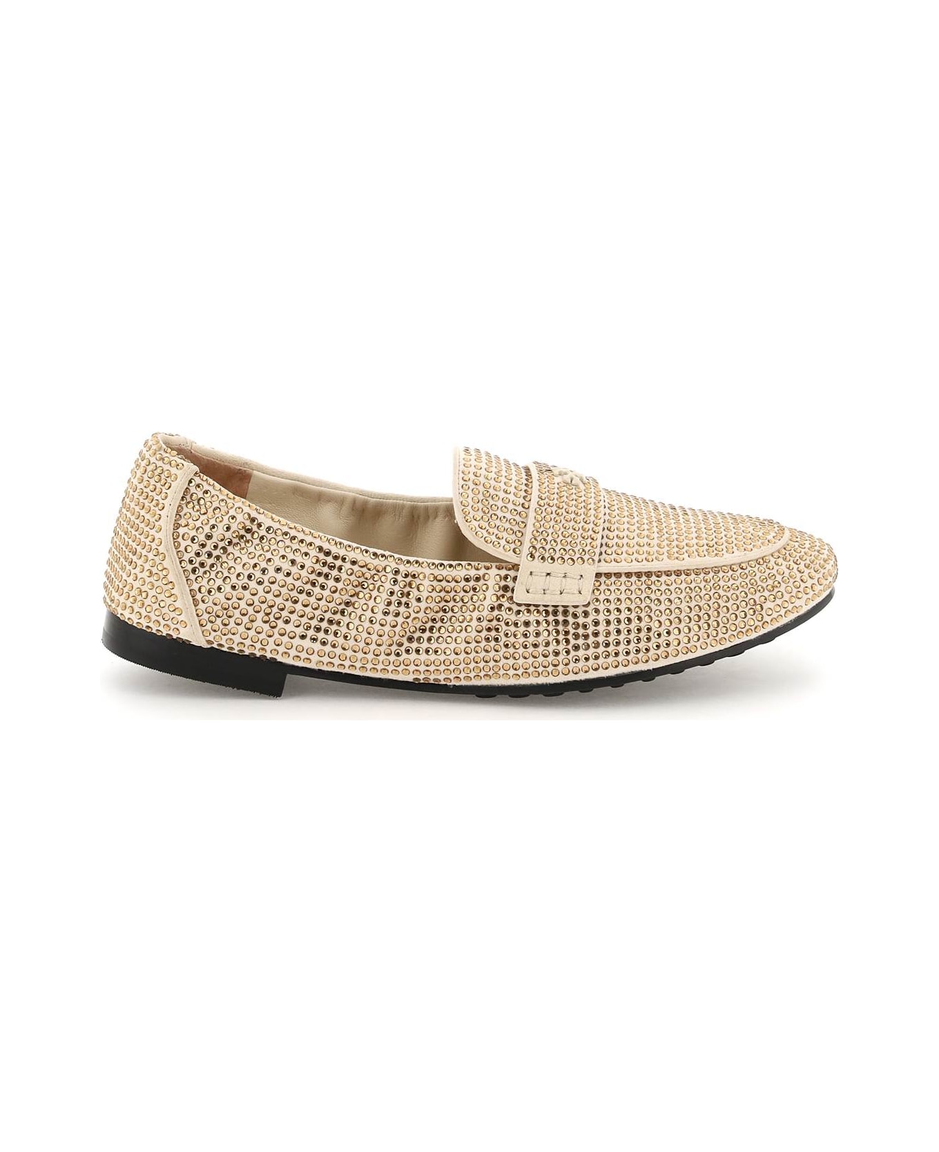 Ballet loafers by Tory Burch in suede with all-over crystal appliques. Varnished-metal double T monogram applied on the penny-bar, stretch side edges, leather lining, insole and sole with rubber inserts.