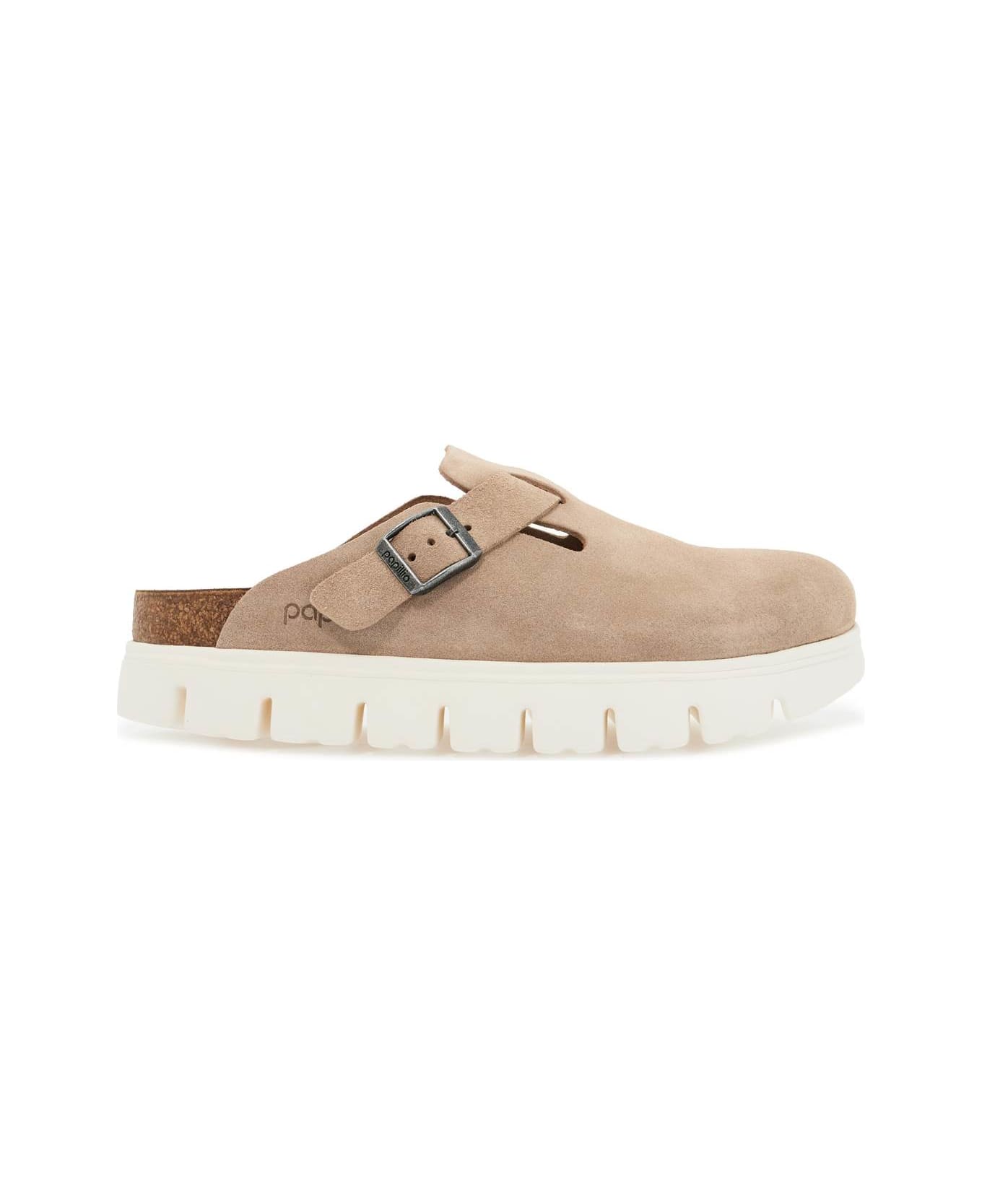 The Papillio line by Birkenstock presents the Boston clogs, made of soft suede leather and featuring a flatform sole in EVA with grooves. The adjustable strap has an antique metal buckle with the brand's logo. The clogs also have a suede leather footbed and an anatomical cork and latex insole for added comfort.