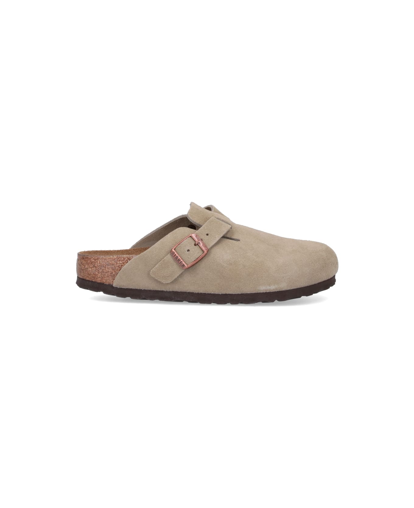 Birkenstock 'Boston' mules in taupe suede with round toe, logo buckle detail, cork midsole, black EVA sole.