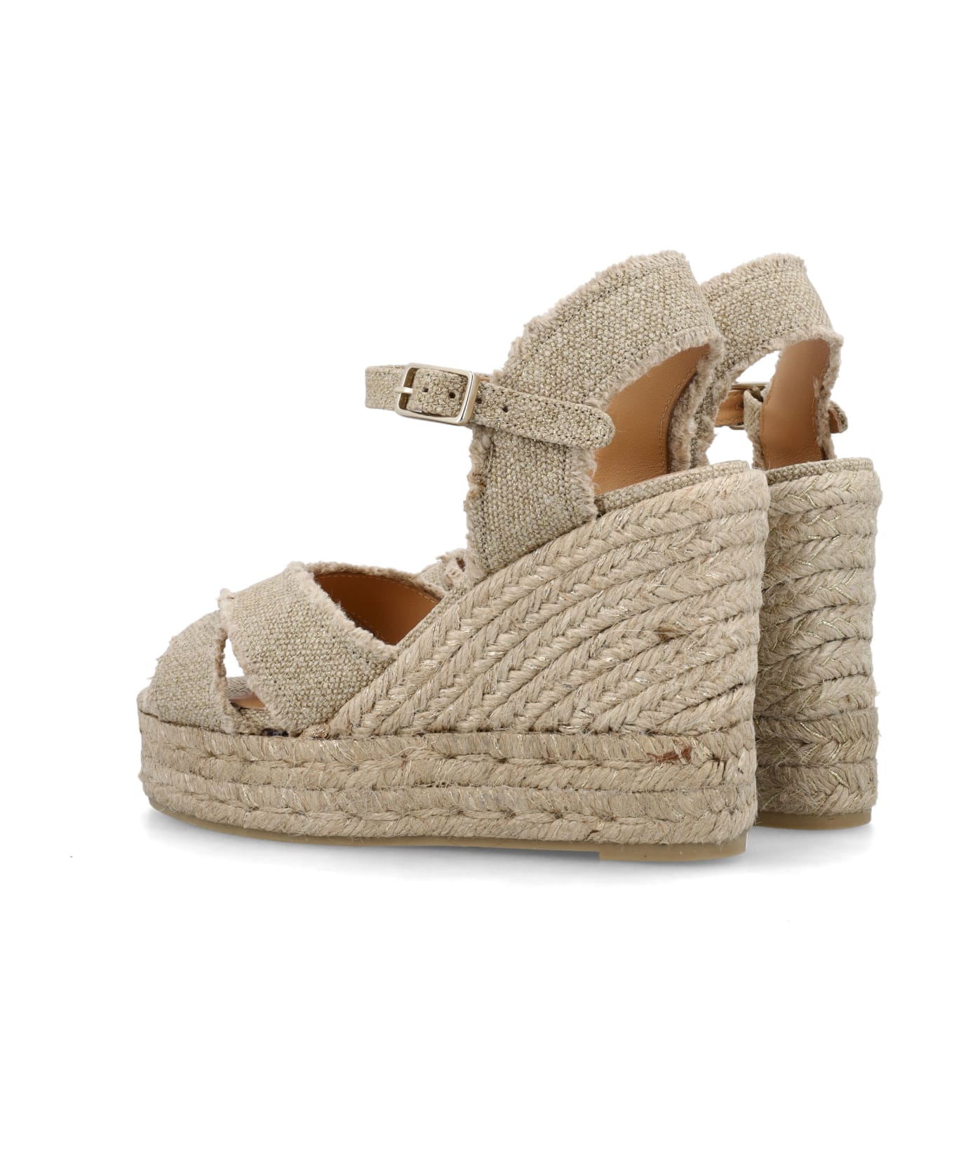 Cotton Bromelia 8 Espadrilles By Castañer. Featuring: Wedge Design Metallic Linen Glitter Effect Design With Crisscrossed Straps Frayed Finishing Ankle Straps Buckle Fastening Open And Rounded Toe Vulcanized Sole Of Jute Natural Colour Gold Lurex And Rubber Heel: 8cm Height Of 11cm, Wedge Of 8cm And Platform Of 3cm